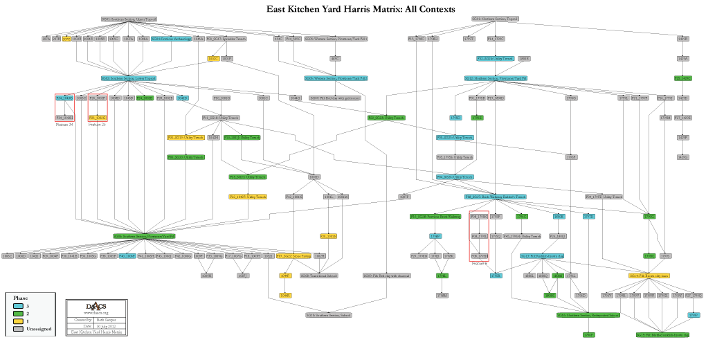 See East Kitchen Yard Site Chronology for detailed stratigraphic and phase information. Please note that some of the contexts present in the chronology analysis are not visualized on the Harris Matrix. The contexts that are not included do not have any stratigraphic relationships with other contexts. The lack of relationships can occur for a few reasons but two common examples are 1) the artifacts are from a surface collection, which is entered into DAACS as a context but does not have recorded relationships to other contexts that are below it; 2) in cases where topsoil and plowzone are stripped and discarded, there may be features below the plowzone that are comprised of a single context. Since the plowzone does not exist as a documented context with artifacts, it cannot seal the single-context feature. DAACS also does not record subsoil as a context, so there is nothing for that single context feature to intrude or seal.