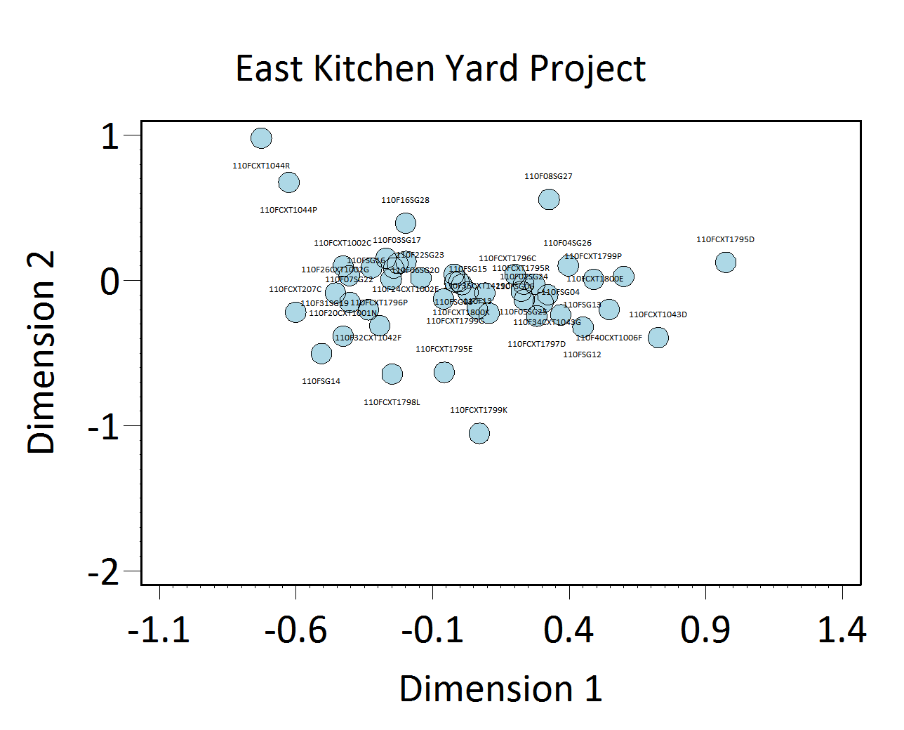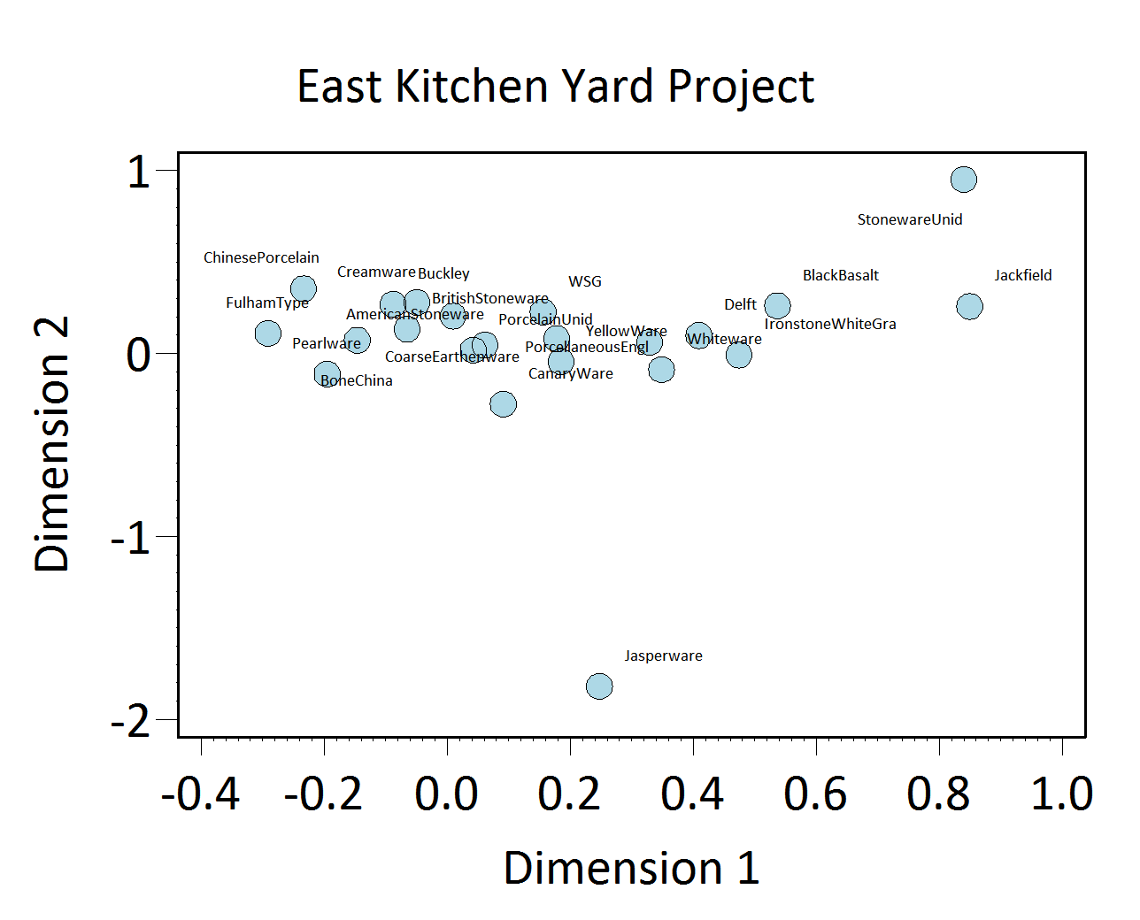 As with other sites in the Archive, the seriation chronology for the East Kitchen Yard was derived from ceramic assemblages aggregated at the level of contexts and stratigraphic groups, and not at the level of features. This is because most contexts and stratigraphic groups on the site were not parts of features. For the relatively few cases where seriated contexts and stratigraphic groups were parts of features, the relevant feature numbers and descriptions are included in the seriation chronology table below. The seriation chronology is the result of a correspondence analysis of ware-type frequencies in each stratigraphic group and each individual context that had no stratigraphic group assignment (Figures 1 and 2). Not all contexts have stratigraphic group assignments.