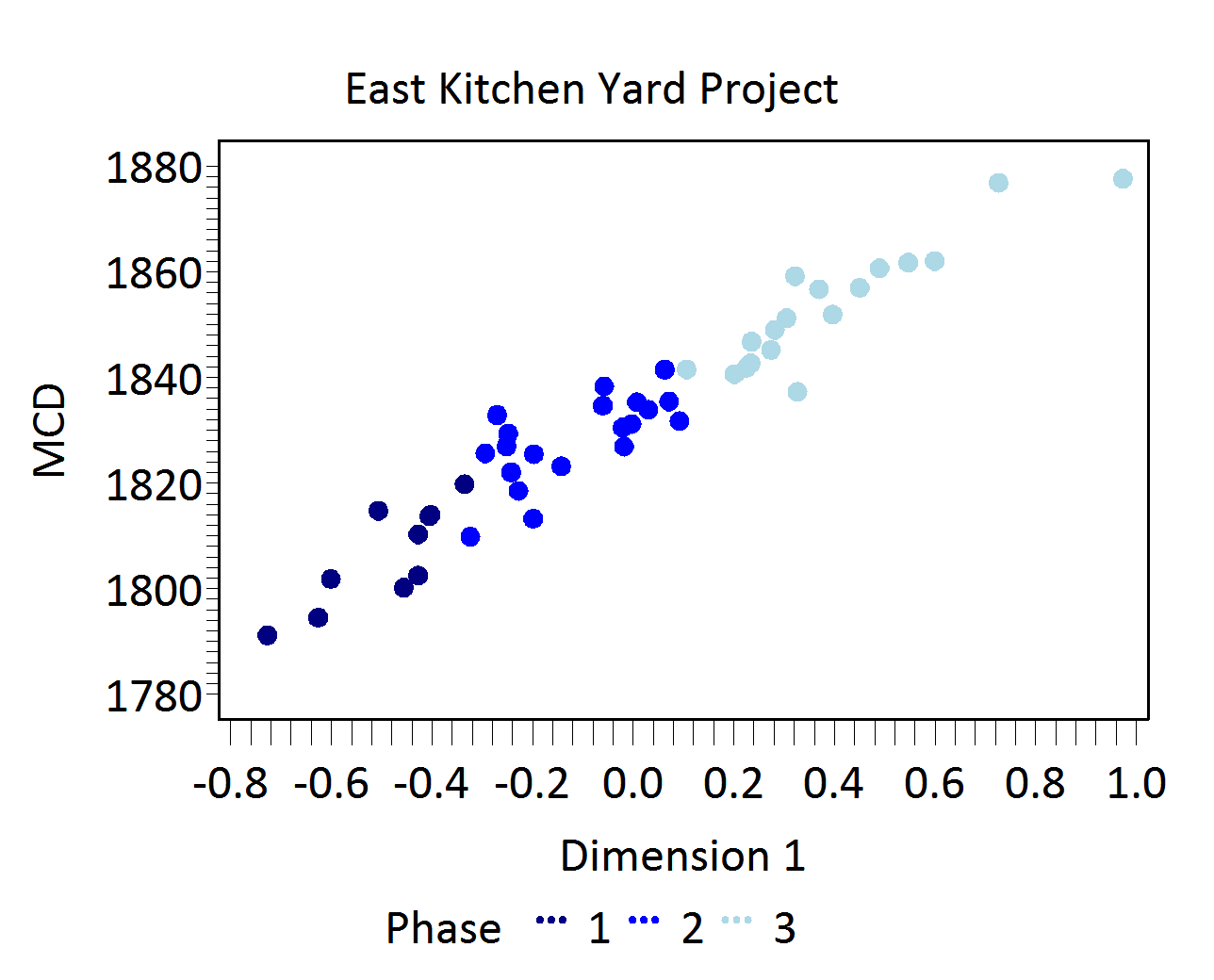 To reduce the noise introduced by sampling error, only ceramic assemblages with more than 5 sherds and more than one ceramic type from individual excavated contexts and from stratigraphic groups were included. SG01 and SG11, two topsoil SGs, and SG05 (a plowzone deposit) were removed from the seriation in an iterative process due to unusually high contributions of these SGs to inertia. Redware and refined stoneware, unidentified were removed for the same reason. The subsequent results produced a strong correlation between Dimension 1 scores and MCDs (Figure 3). Based on the dips in ceramic counts observed in a histogram of Dimension 1, we divided the East Kitchen Yard site into three phases (Figure 4).