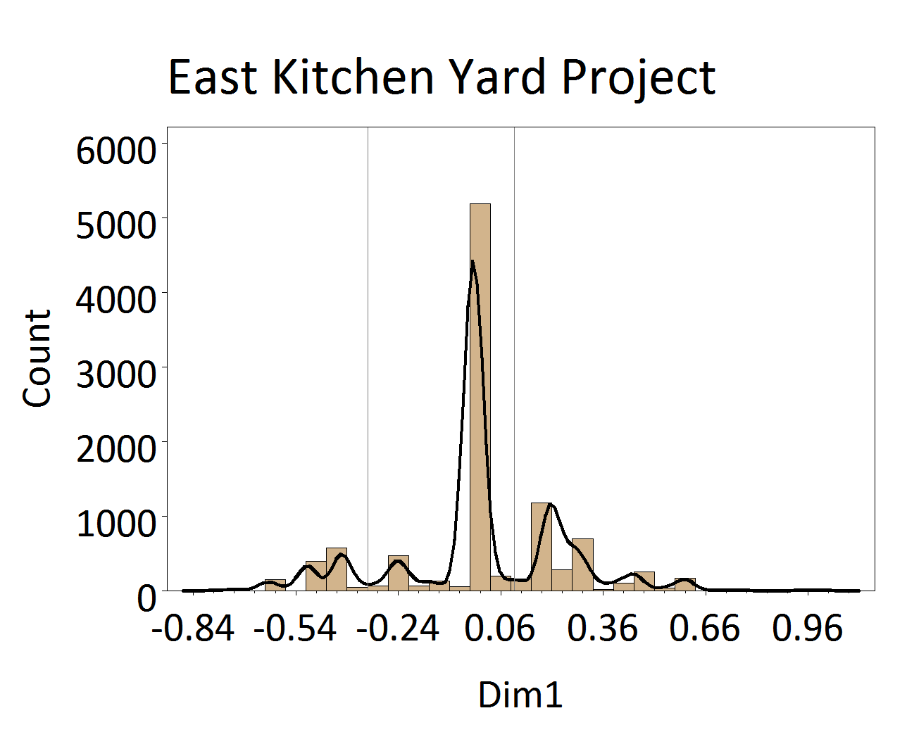 Figure 4. Histogram of ceramics from the Project plotted along CA Dimension 1. The lines indicate DAACS phase divisions.