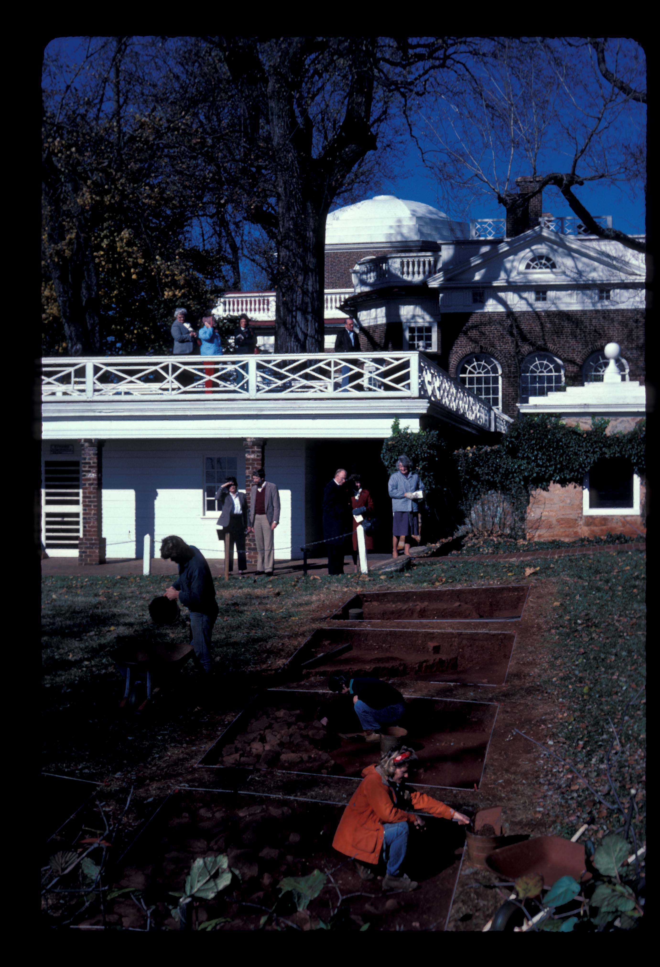 In 1993, Susan Kern excavated six ten-foot by eight-foot quadrats adjoining the brick walkway that parallels the South Dependency wing. Utility lines and trenches as well as deep fill were discovered. No identifiable Jefferson-period features were found in Kern’s excavations.