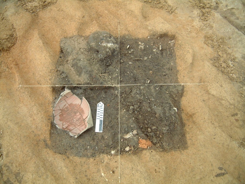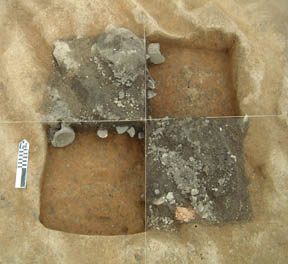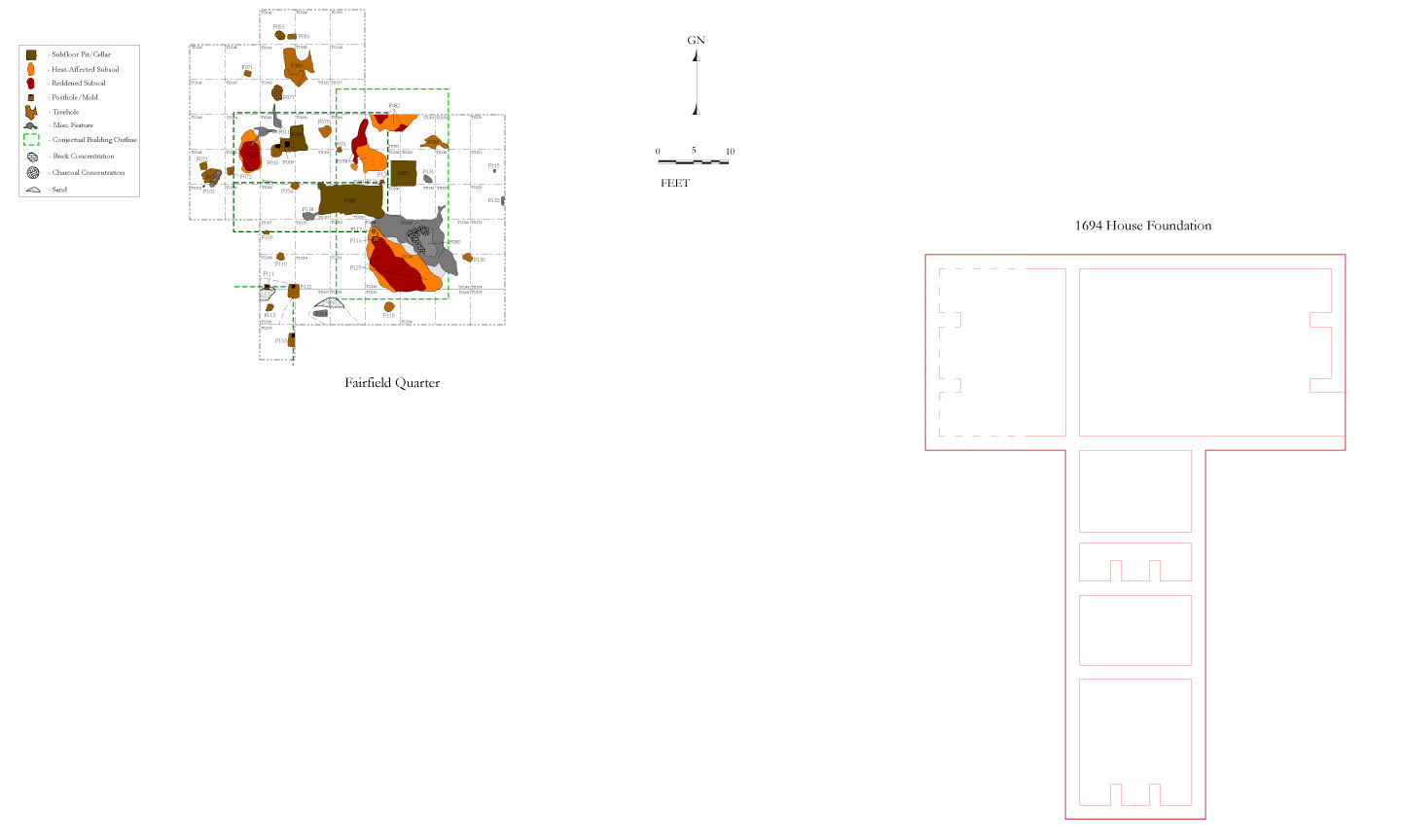 In 2001, during the investigation of a GPR anomaly, Fairfield archaeologists David Brown, Thane Harpole, and Anthony Smith excavated a block of seven 5-by-5 foot test units approximately 85 feet to the west of the 1694 manor house. The area was selected for the GPR study after shovel testing at 25-foot intervals revealed significant concentrations of artifacts in the plowed soils. After identifying a subfloor pit and significant concentrations of eighteenth-century artifacts in the plowzone, sixteen additional units were excavated, uncovering a roughly twenty-five foot square area. Within this area archaeologists identified two burnt-subsoil concentrations (Features 78 and 79) likely associated with hearths as well as numerous postholes, tree holes, and rodent burrows.