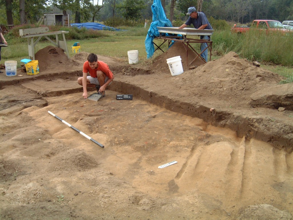 Feature excavation continued during the summers of 2002 and 2003. The southern half of the subfloor pit (Feature 8) was excavated in three natural layers with 10-liter samples floated from layers B and C and the remainder waterscreened through 1/16-inch window mesh. The east half of a posthole (Feature 9) cut through the subfloor pit and was excavated and screened through ¼-inch wire mesh prior to the excavation of Feature 8. All sampled features were bisected. The soil from subfloor pits and cellars was floated, while the soils from all other features were waterscreened through 1/16-inch window mesh.