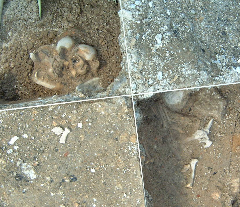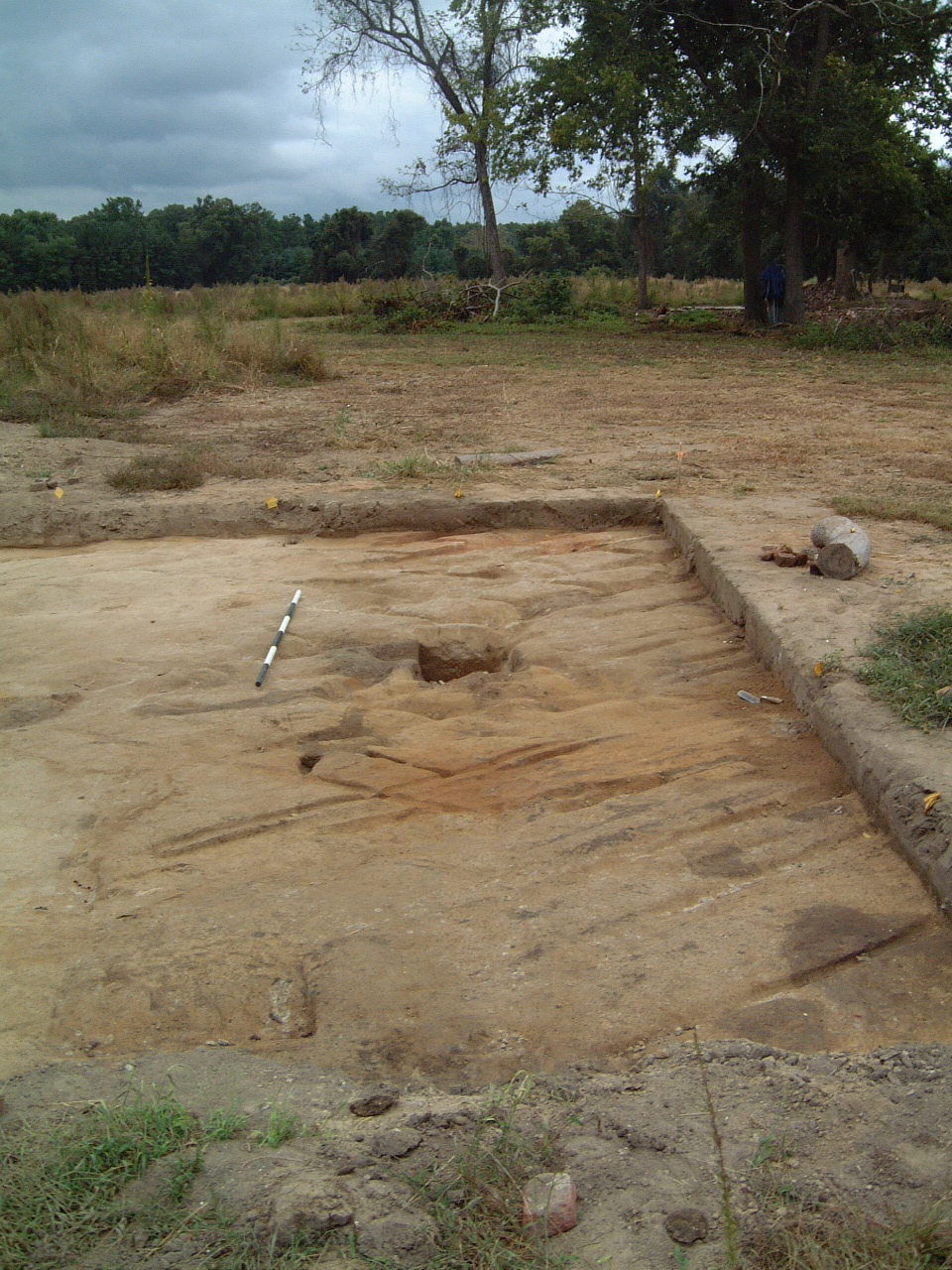A fourth building may exist north of this post-in-ground structure. Three brick-filled holes (Features 10, 55, and 77) in the northwestern portion of the excavation area, one with a possible postmold (Feature 10) and two with repairs (Features 9 and 56), appear to be aligned with the southern structure. Similar features were not found to the west of this line, but their relatively shallow profile may have led to their destruction by deeper plowing in this area of the site. One of the brick-filled holes (Feature 9) cuts through the original subfloor pit (Feature 8), suggesting a later date for this possible structure, as well as for the structure to the south that is its likely contemporary. No diagnostic artifacts were found within the sampled portions of these features.