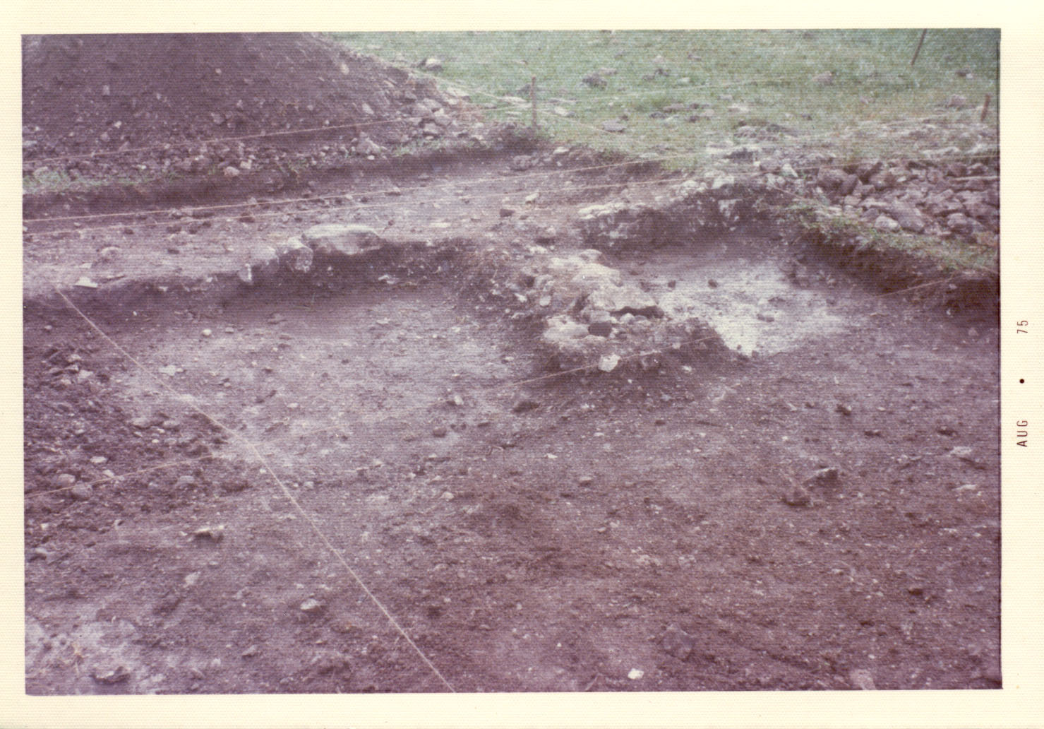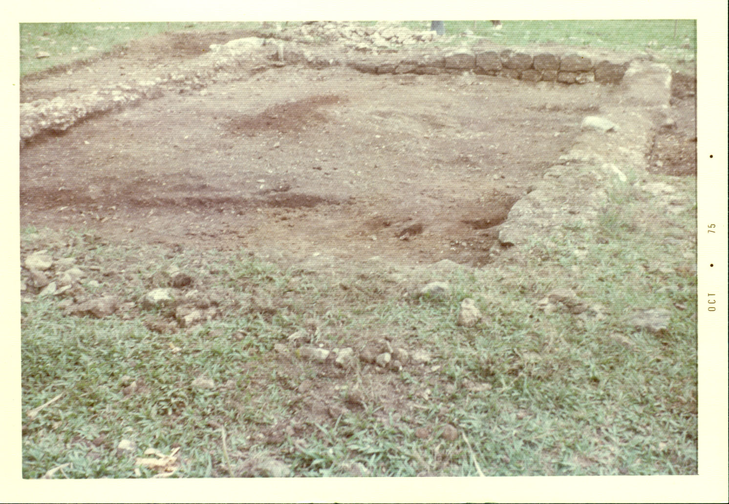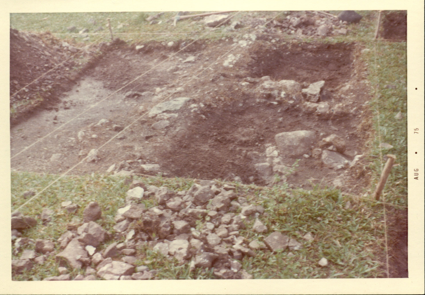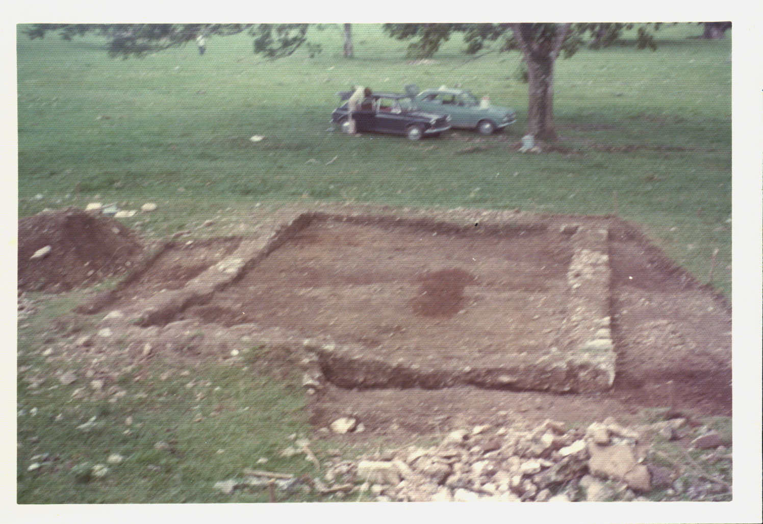 House 26 was the first domestic site excavated at New Montpelier. The site was chosen because it presented a rectangular shape that was easily identified in the grassy surface, with some elements of the stone foundation protruding, and because it was near to the centre of the known village area and immediately beside what appeared to be a shallow sunken pathway leading upslope through the village. Extensive excavation in 1973 and 1975 exposed a complete stone foundation with evidence of occupation during the final decades of slavery and beyond abolition down to about 1860.