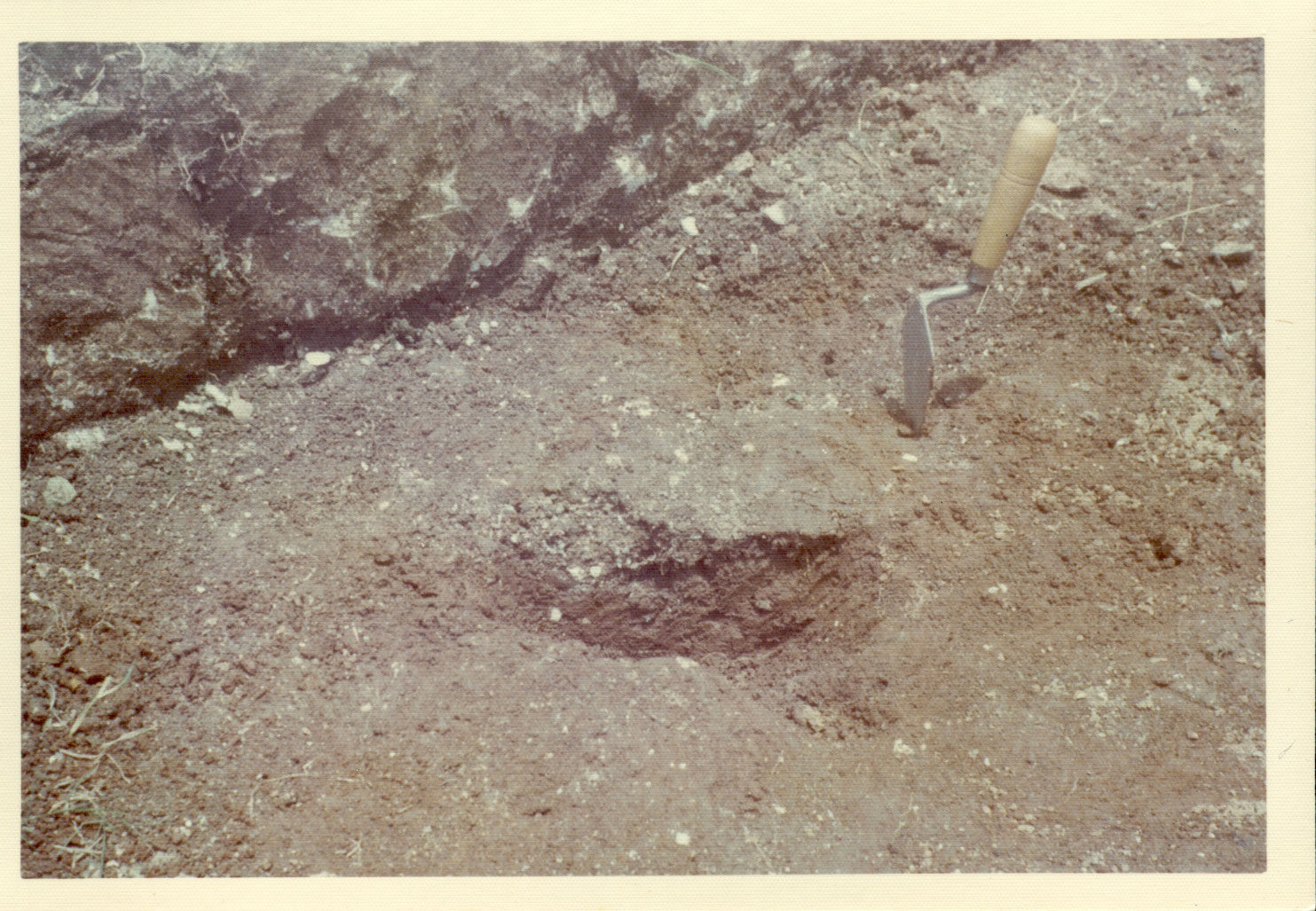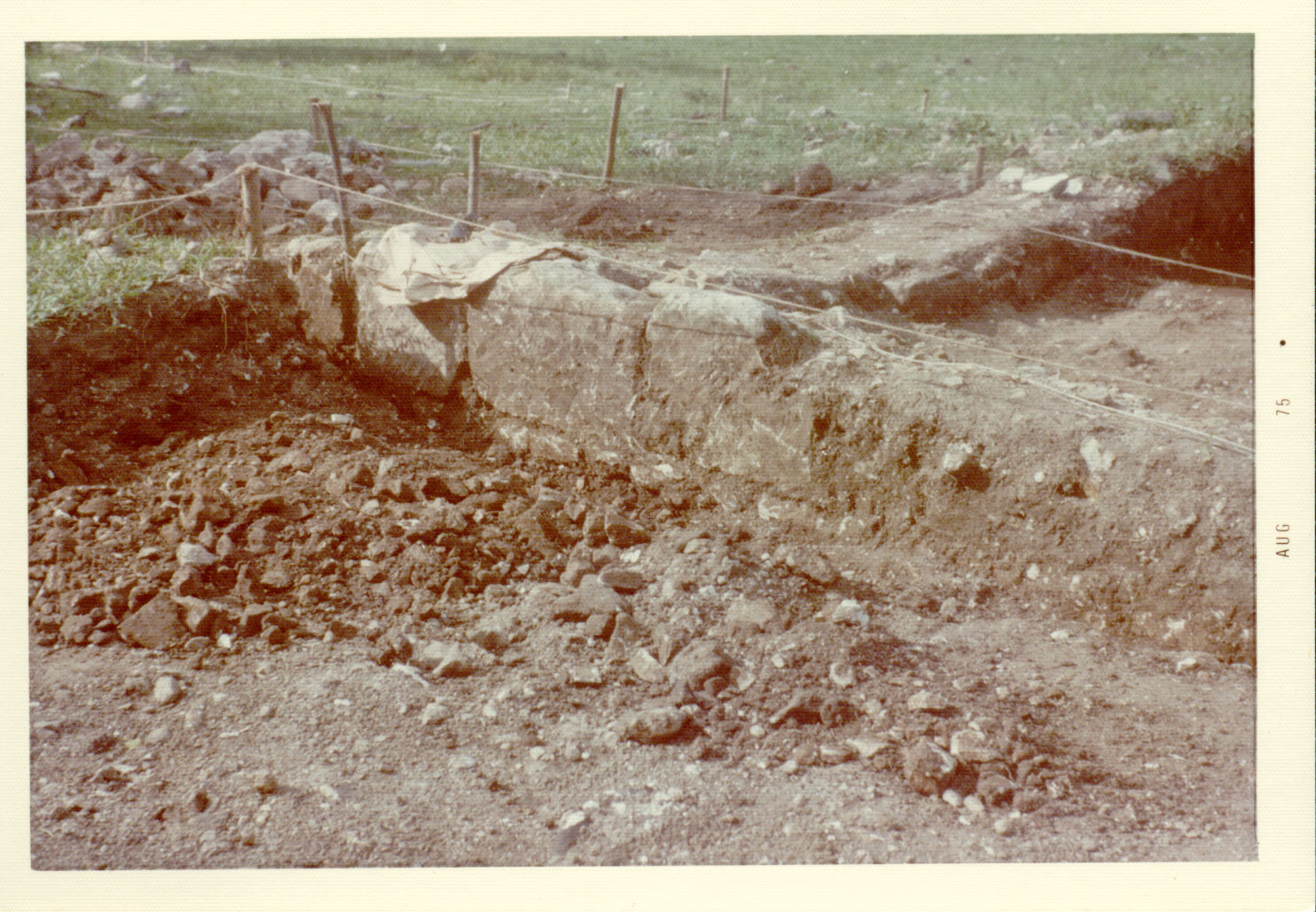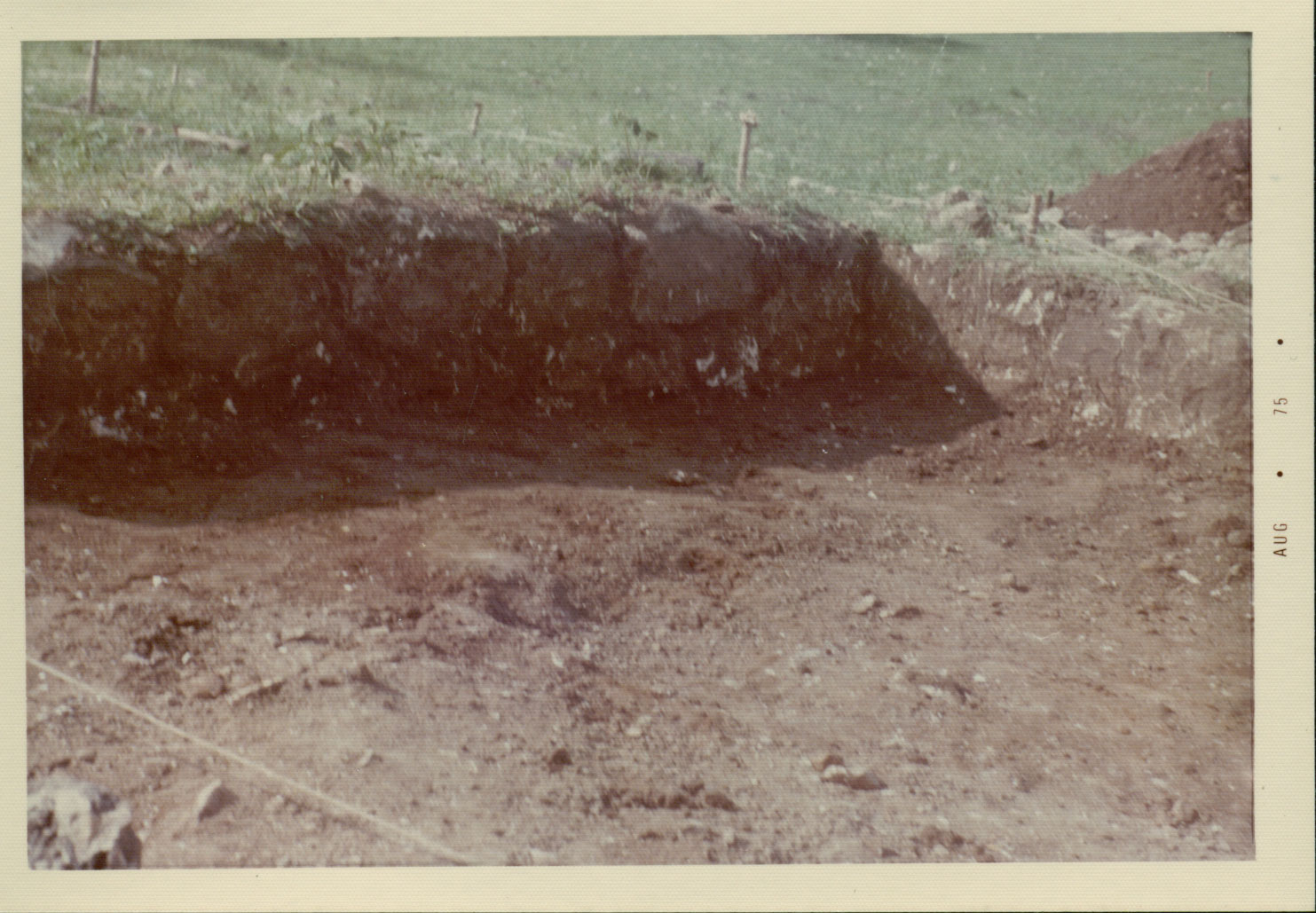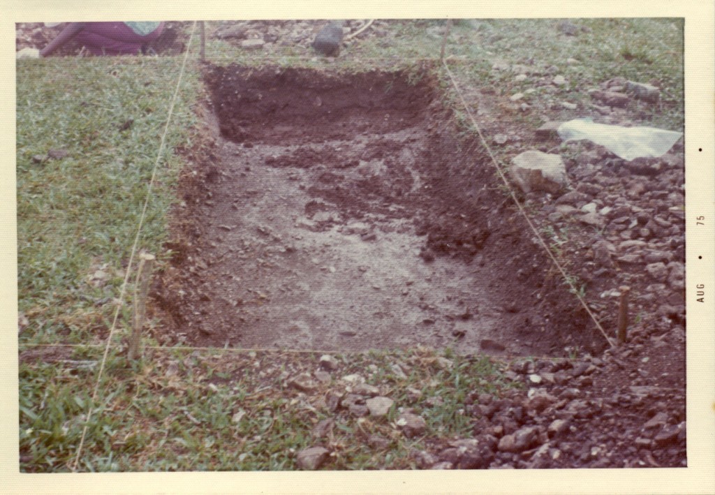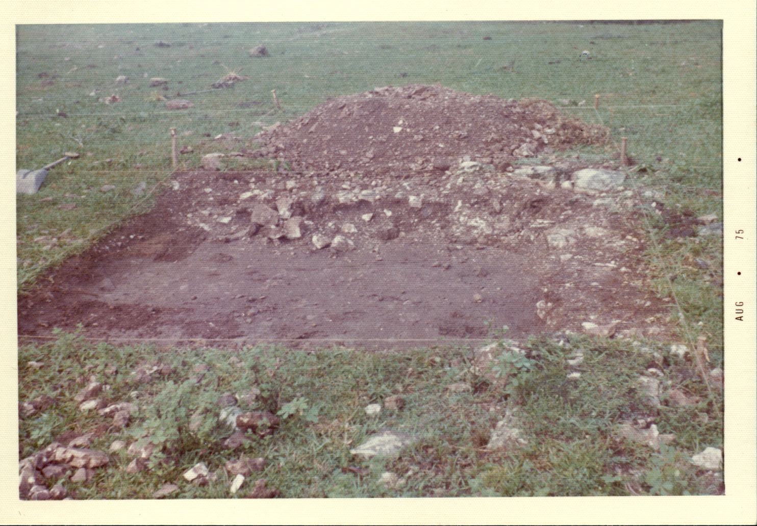 House 26 was the first domestic site excavated at New Montpelier. The site was chosen because it presented a rectangular shape that was easily identified in the grassy surface, with some elements of the stone foundation protruding, and because it was near to the centre of the known village area and immediately beside what appeared to be a shallow sunken pathway leading upslope through the village. Extensive excavation in 1973 and 1975 exposed a complete stone foundation with evidence of occupation during the final decades of slavery and beyond abolition down to about 1860.