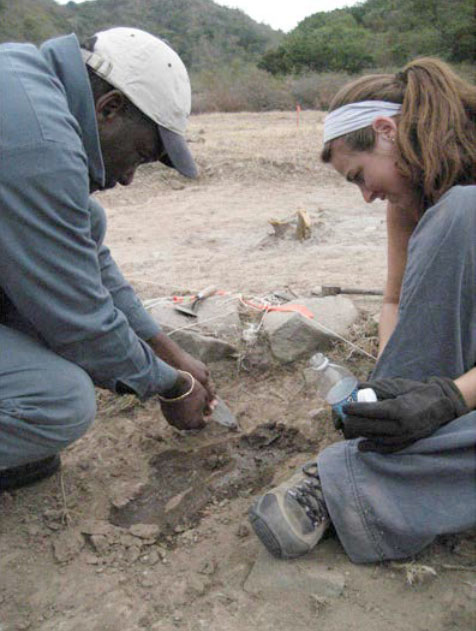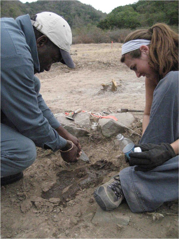 Silvester Silcott and Kate DesCoteaux excavate an embedded sherd of Afro-Caribbean ceramic from Area 1 at the Worker’s Village.