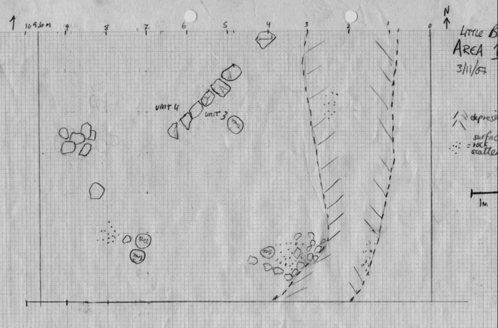Three 1-x-1 meter test units, TU1, TU2 and TU5, were begun in Area 2. Only the topsoil layer of these three units was exavated, therefore there are no later stratigraphic or artifact data from these units. Test units 3 and 4 were opened and excavated in Area 1. These two 1-x-1 meter units were excavated to a “transitional subsoil”, however no depth for these layers were recorded in the field notes.