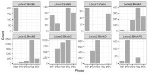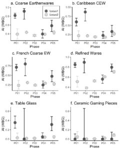 Bates et al. also analyzed the discard of various artifact types by phase, demonstrating that in Plantation Phases 1 and 2, the Locus 1 household has much higher wealth levels than the Locus 2 households (Figure 2). After Phase 3, Locus 1 wealth drops precipitously, leading to our inference that hired overseers replaced owners in the early nineteenth century (after Phase 3).