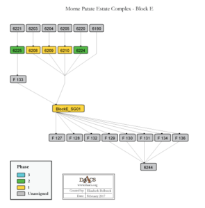 See Morne Patate Village Chronology for stratigraphic and phase information. For a printable version, download the PDFs: Block E Harris Matrix; Estate House Harris Matrix; Estate Kitchen Harris Matrix; Modern Stable Harris Matrix.