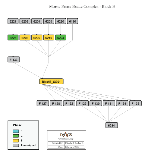 The Harris Matrix summarizes stratigraphic relationships among excavated contexts and groups of contexts that DAACS staff has identified as part of the same stratigraphic group. Stratigraphic groups and contexts are represented as boxes, while lines connecting them represent temporal relationships implied by the site’s stratification, as recorded by the site’s excavators (Harris 1979). Stratigraphic groups, which represent multiple contexts, are identified on the diagram by numeric designations (e.g., SG01). Contexts that could not be assigned to stratigraphic groups are identified by their individual context, or FS, numbers (e.g. 6120, 6205, etc. ).