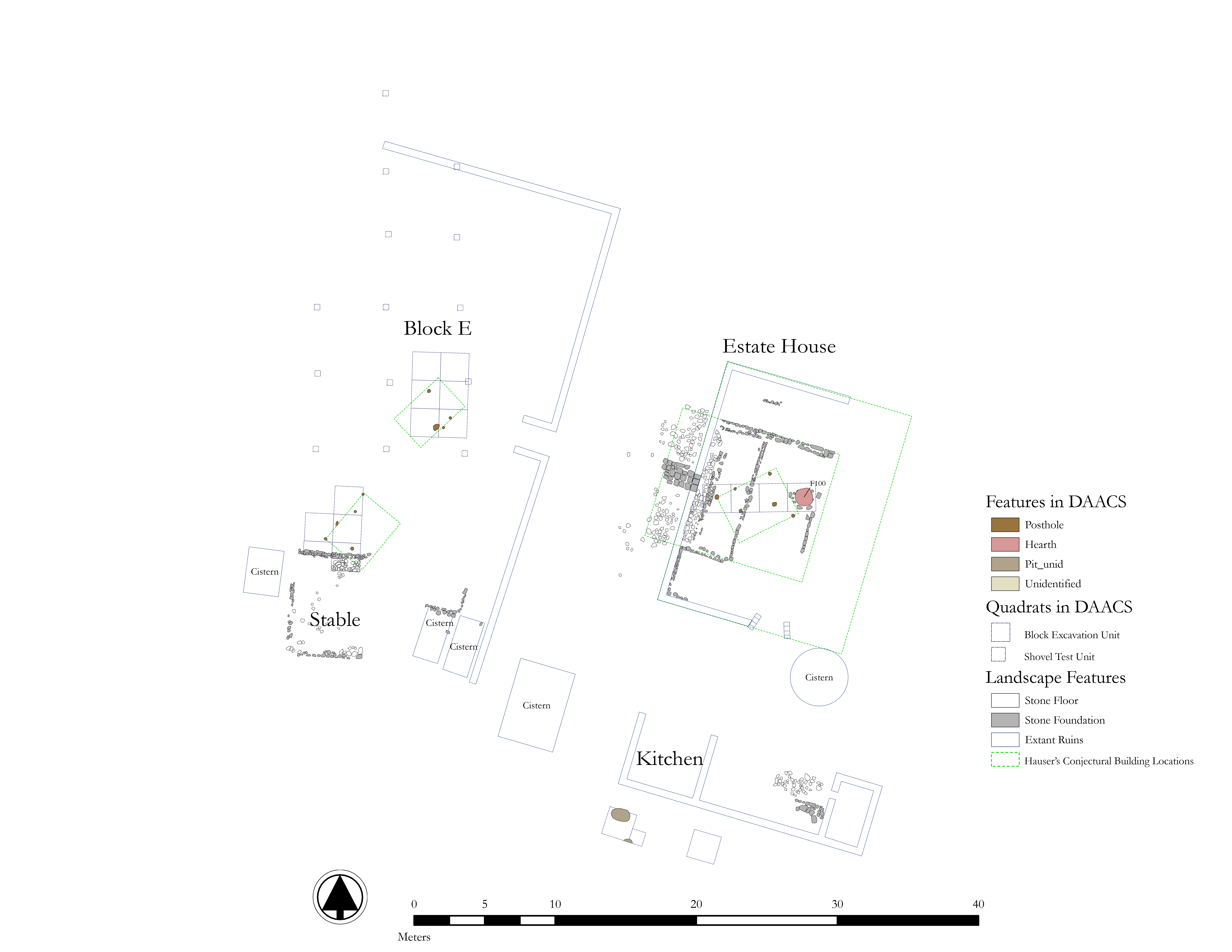 PDF of Morne Patate Estate House and Dependencies site plan with excavated features labeled, compiled by DAACS using maps provided by Mark Hauser, Principal Investigator.