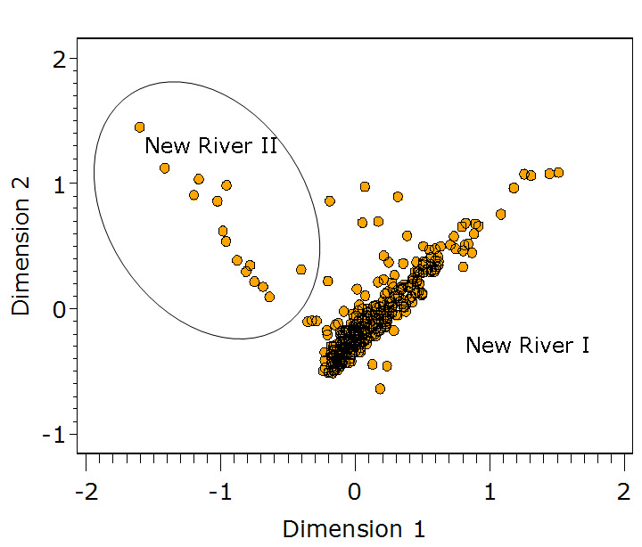 The CA results for New River II indicates that there is no temporal trend within the village (Figure 1). However, village-wide Mean Ceramic Date of 1853 puts the village’s occupation in the mid 1800s. Two other measures that are less sensitive to excavation errors and taphonomic processes that might introduce a small amount of anomalously late material into an assemblage were used. They are TPQp90 and TPQp95. The TPQp95 of 1820 provides a robust estimate of the site’s TPQ based on the 95th percentile of the beginning manufacturing dates for all the artifacts comprising it. The TPQp90 of 1820 provides a more robust estimate of the site’s TPQ based on the 90th percentile of the beginning manufacturing dates for all the artifacts comprising it.
