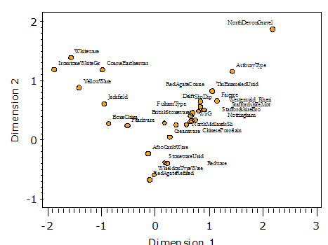 The corresponding plot of ware types reveals that CA axis 1 captures time: later types lie on the right, and earlier types are on the left (Figure 3). The relationship with time is confirmed in a plot of axis-1 scores against MCDs (Figure 4).