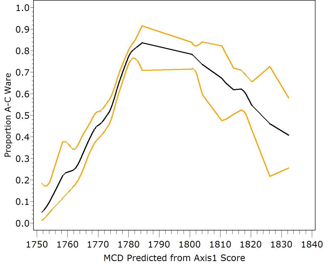We plotted the proportion of Afro-Caribbean ware in each STP against the CA axis-1 scores, which we know capture time. In order to put the result on a calendar year scale, we regressed the MCDs on the Axis 1 scores. We use the predicted MCDs to preserve the statistically desirable properties of the CA scores while re-expressing them on a rough calendar year scale. The final step is to fit a regression spline with binomial errors to the AC-Ware proportions. The fitted curve is plotted against the predicted MCDs in Exhibit 4.