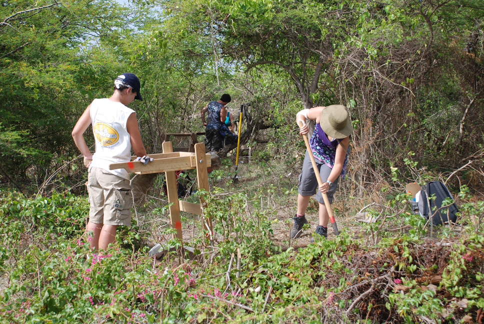 At the end of the survey season in July 2008, SKNDAI staff excavated 17 pits between the cistern and stone house foundation at New River II. They also mapped the location of the cistern, historic structure, and terraces using a total station. This area is covered in light shrubbery and is currently used by the Nevis’s Department of Agriculture as an informal apiary.