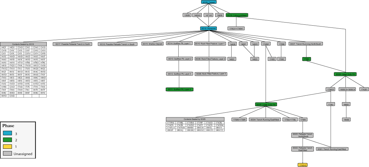The stratigraphic relationships among stratigraphic groups and unassigned contexts are summarized in the Harris Matrix for the site. Phase assignments from the seriation are shown on the Harris Matrix in color, facilitating comparison of the seriation chronology and the stratigraphic chronology of the site.