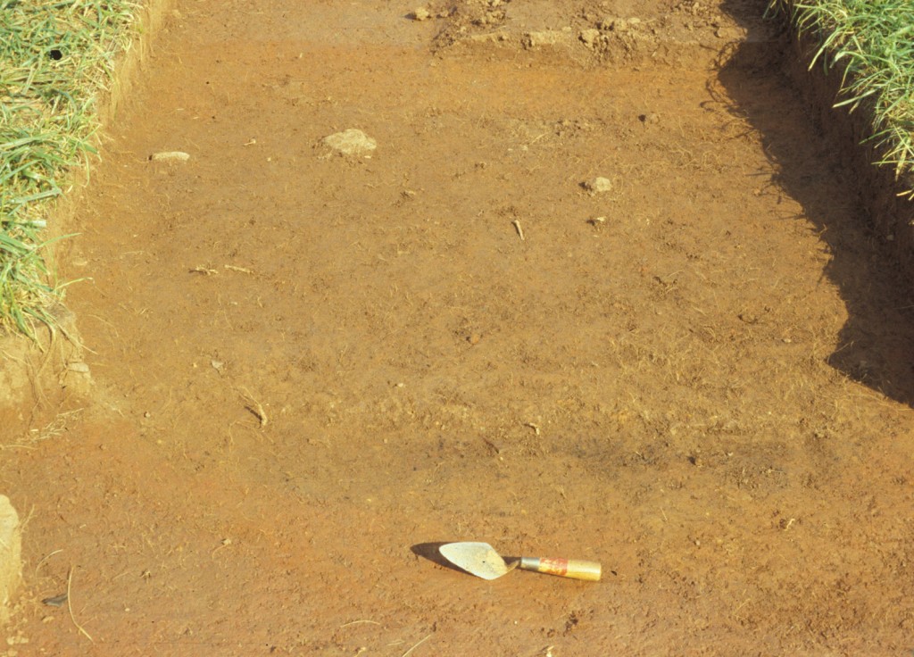 In 1993, archaeologists tested the eastern edge of the site along the route of a proposed tree screen with three rows of auger holes spaced 25 feet apart east-west and at staggered 25 foot intervals north-south. Each auger hole was scraped to identify soil layers and look for features and artifacts. Soil removed by the auger was trowel sorted to locate artifacts. Auger holes containing artifacts or features were expanded with shovels into 2 foot square test units to provide additional data.