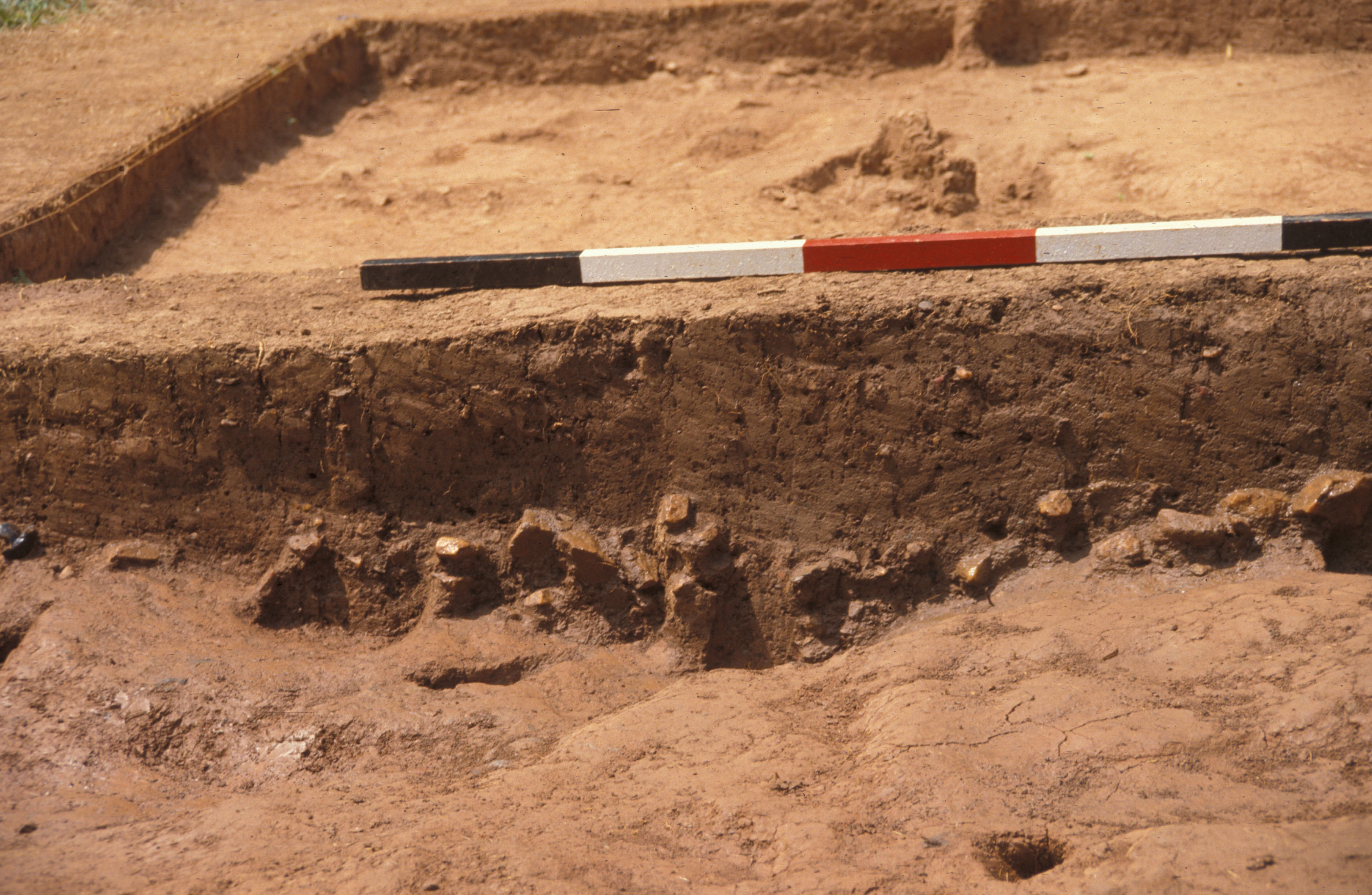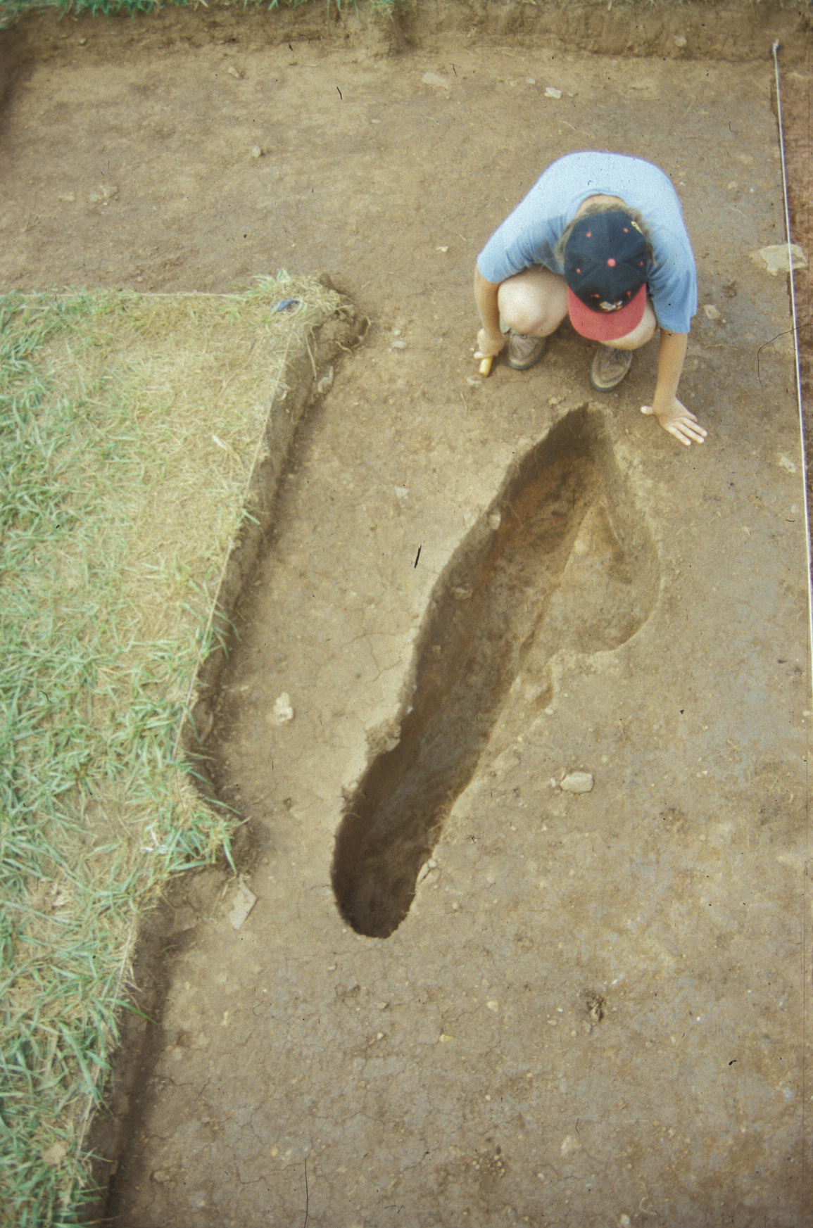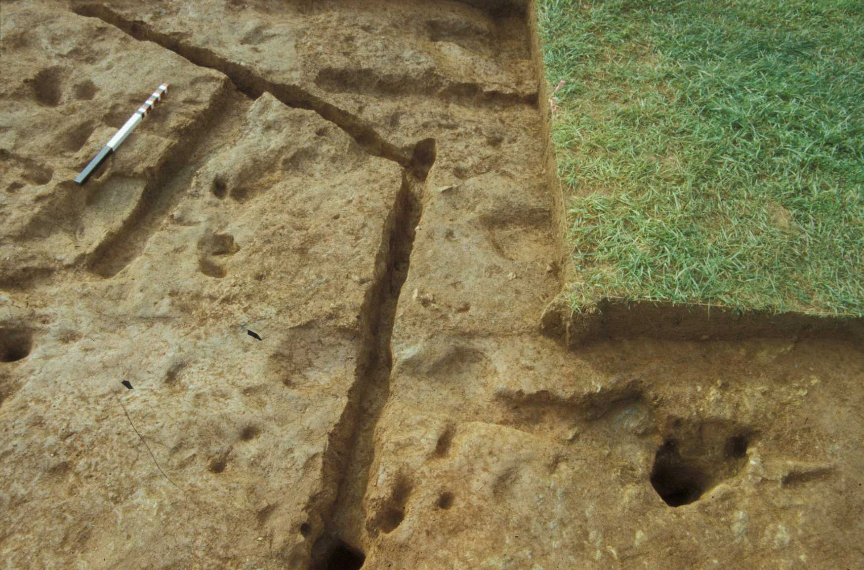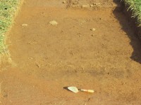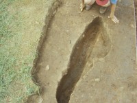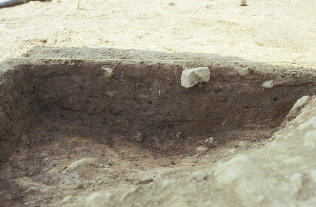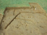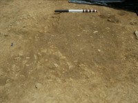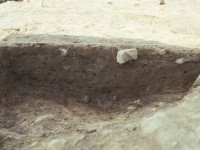 Two linear trenches (F01 and F02) averaging 0.4-0.5 feet in width converged and cut the eastern edge of the gully. The east-west trench ran approximately 29 feet before it was obliterated by plowing. Excavators traced the north-south trench for a distance of 46 feet when time limits precluded further testing. The two trenches contained the remains of small post molds at their bases, suggesting that they represent the remains of a fence constructed with narrow posts set into the ground. The fence post-dates the occupation of this site, and is believed to be associated with a hypothesized early 19th-century site located southeast of the North Hill. The upper level of gully fill appears to be contemporaneous with this hypothesized later structure, while the deeper layers appear to have been filled at the same time the subfloor pit was filled.