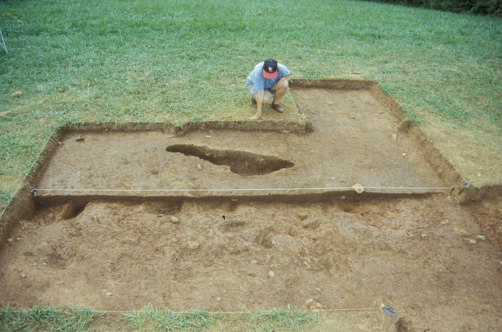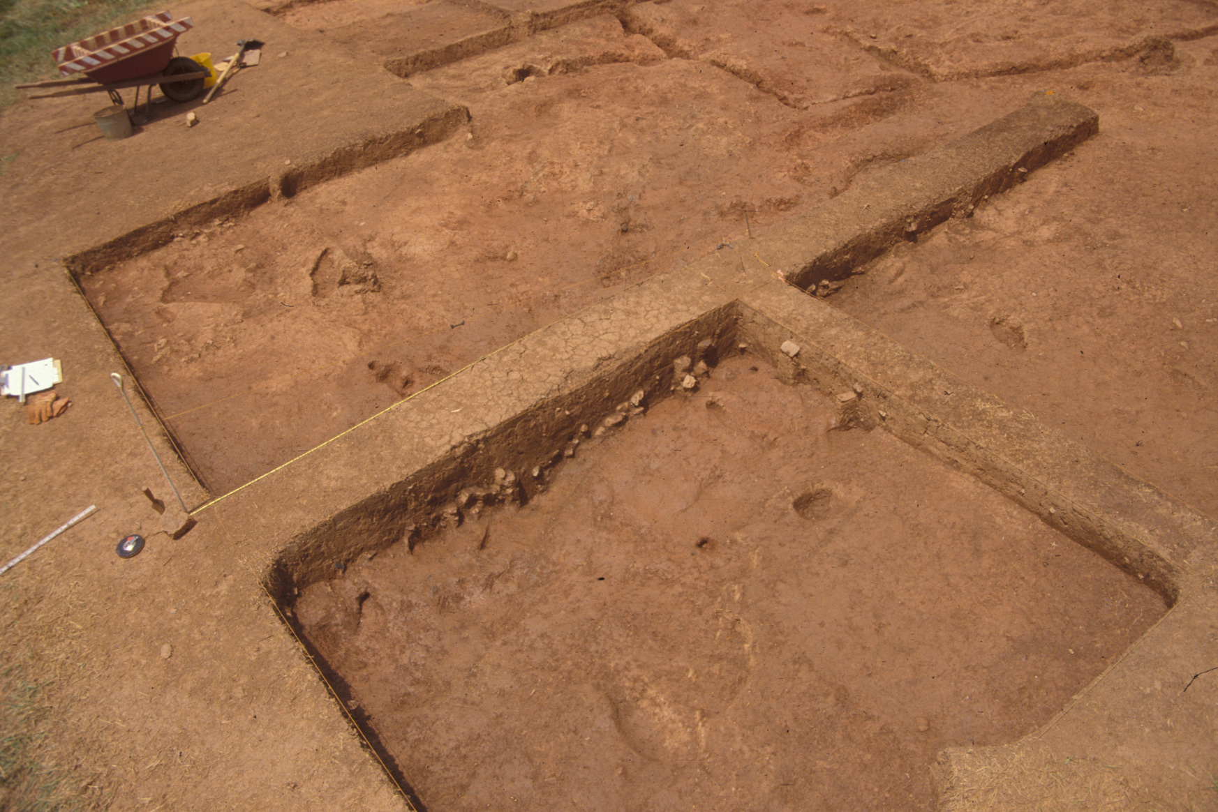 In 1994, archaeologists conducted a standard Phase 1 survey across the terrace, excavating a total of seventeen 2 foot square test units at 25 foot intervals. Based on the results of the survey, 50 10 foot square excavation units, 3 5 foot-by-10 foot and 1 partial 10 foot square were excavated. Data from the 2 foot test units was merged into the larger 10 foot squares where appropriate. When finished, block excavations at the site measured 80 feet-by-110 feet at their greatest extent.