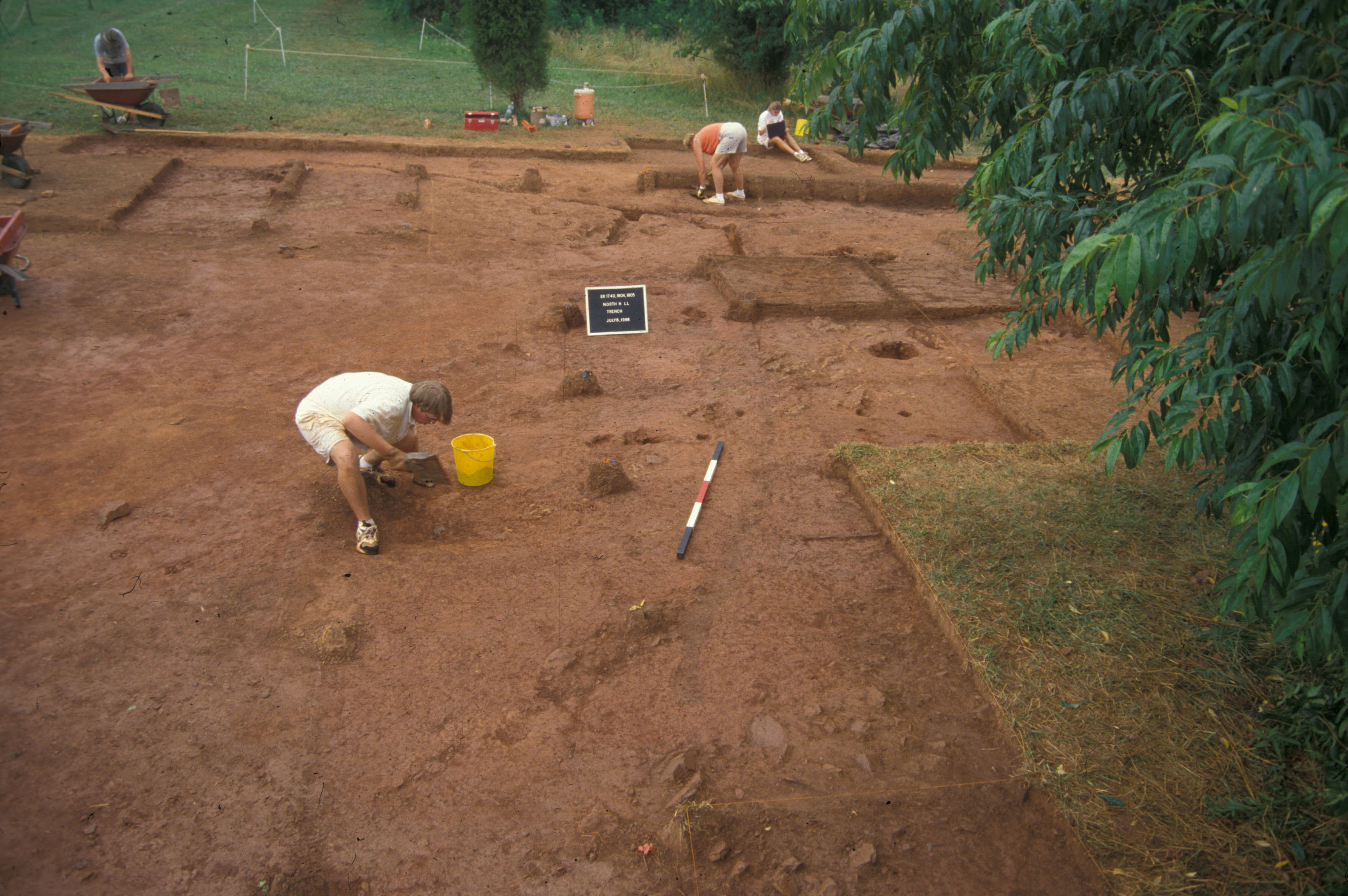 Staff archaeologists surveyed the eastern property boundary in 1993 in preparation for the planting of a tree screen to block the view of modern development (Heath 1993). The discovery of significant sites in this area, including the North Hill site, altered the planting plan, and it has not been implemented. Surface-collected artifacts from an adjacent property owner’s garden confirmed the location of a late 18th- or early 19th-century site on the terrace. Staff and volunteers dug additional test units across the site in the spring of 1994, and a combination of staff, field school participants and volunteers conducted excavations between 1995 and 1998. Barbara J. Heath directed the project with the assistance of field supervisor Michael A. Strutt and laboratory supervisors Alasdair Brooks and Heather Olson.