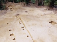 Excavations of the site took place during June and July of 1998-1999. The site was mechanically stripped of young trees and dense ground vegetation at the early stage of the excavation. The plowzone extended 11-56 cm below grade across the site. In addition to plowing, recent construction activities also impacted the site. The expansion of Route 60 and the construction of a house adjacent to the site sometime during the 20th century led to heavy disturbance of the plowzone layer along the site’s eastern and southern bounds. Machine push piles of redeposited subsoil and gray silt were discovered on top of and mixed with plowzone. These activities did not appear to have disturbed any of the excavated features, although evidence of cultural activities that might have extended east and south of the excavation unit were probably destroyed.
