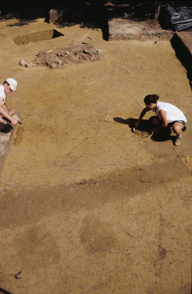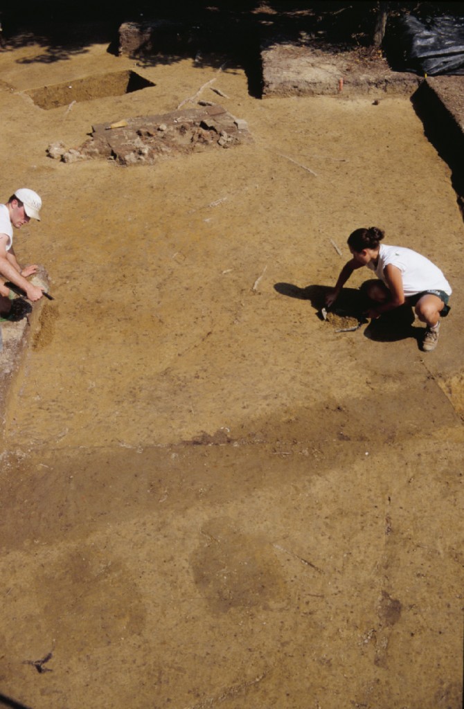 The general excavation unit measured 20 x 32 meters; archaeologists dug a total of 75 2 x 2 m and two 1 x 2 m units. In addition, ten 1 x 1 m test units extending to the north and west of the excavation were also dug as part of a limited site survey in 1999. The plowzone, redeposited subsoil and silt layers were removed by shovel-shaving to subsoil, although three transects were machine graded to subsoil (along 990E/997E-1013E, 1004N-992N/995E-997E). In general, a 25-percent sample from each 2 x 2 m unit was dry-screened through 1/4” mesh.