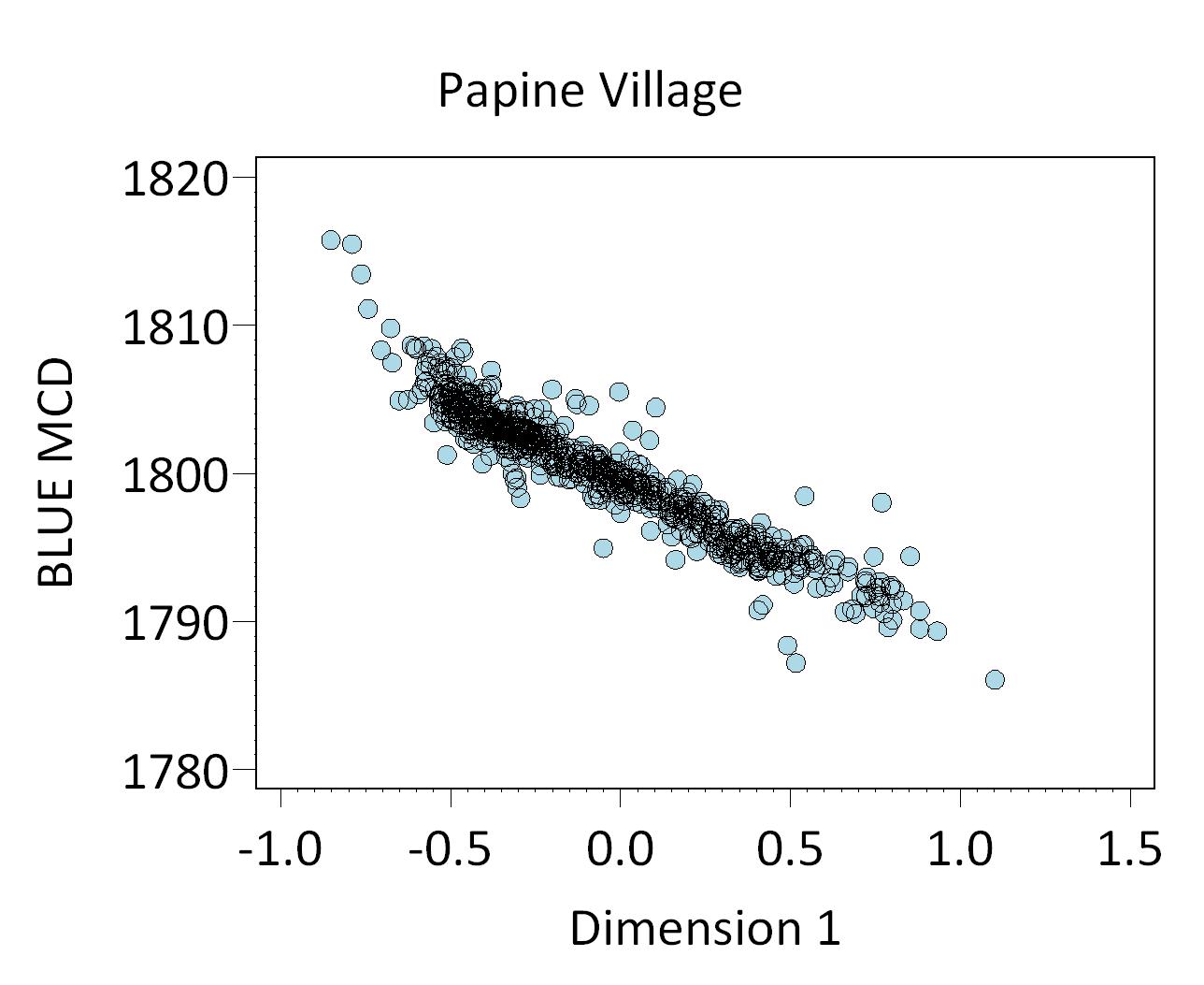 Figure 1. Plot of Blue MCDs by Dimension 1 scores for shovel-test-pit assemblages from the Papine Village.