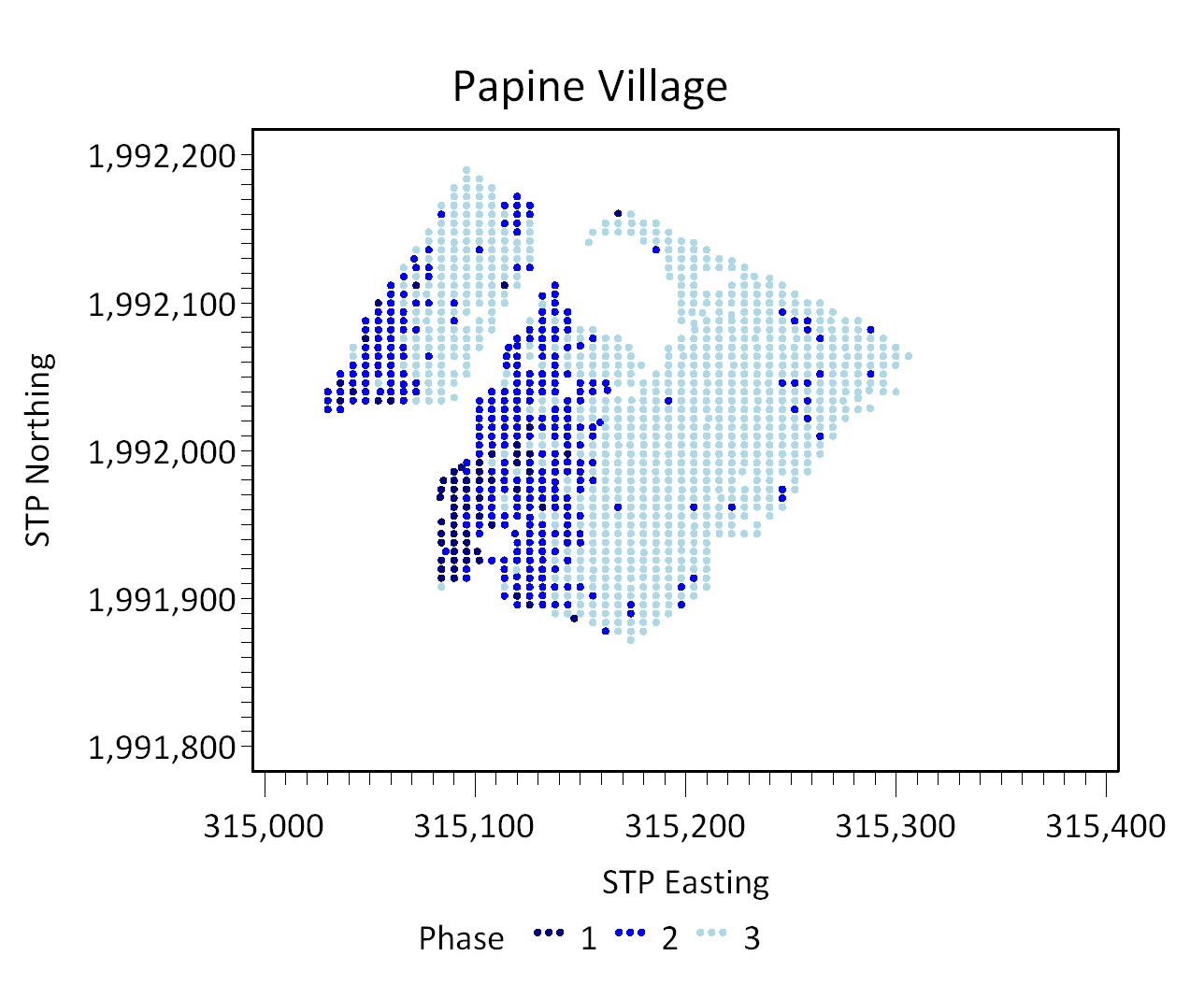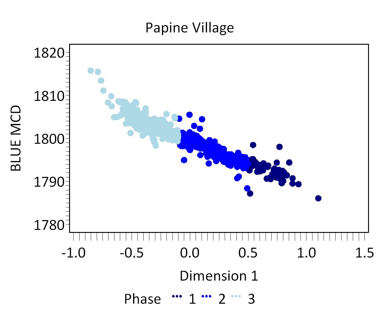 The smoothed ceramic ware-type frequencies for the village fit the expectations of the seriation model well, witness the point configuration in the plot of STP assemblages on the first two CA dimensions (Figure 1). The corresponding plot of ware types reveals that CA axis 1 (Dimension 1) reflects a temporal trend, with early ware types on the right and later ware types on the left. A histrogram of ceramic sherds from Papine by Dimension 1 shows the three phases. The plot of the Dimension 1 scores against BLUE MCDs demonstrates the strongly temporal association, especially visible when the STPs are coded with their Phase assigment. When the Phase assignments were mapped onto the shovel-test-pits, the earliest, Phase 1 occupation is seen along the western side of the site, just southwest of the mill. Phase 2 is primarily on the western side of the aqueduct with Phase 3, representing the latest occupation, spreading far across the eastern half of the village.