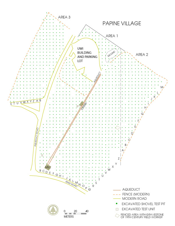 Beginning in January 2008, UWI, Mona and The Digital Archaeological Archive of Comparative Slavery began a systematic shovel-test-pit survey of the Papine Village. Led by Dr. Sabrina Rampersad (UWI) and Dr. Jillian Galle (DAACS), UWI students and DAACS staff worked together to excavate 50 centimeter in diameter shovel-test pits every six meters across the entire village area, including the fields east and west of the aqueduct, north of Aqueduct Flats and west of Aqueduct Road, prior to the construction of the new UWI Basic Medical Sciences Complex. Field work was conducted for approximately 15 days every January in 2008, 2009, and 2010. During this time 1207 STPs and four 1-x-1 meter units were excavated. Another two units adjacent to the cistern were begun but not completed due to time constraints. Completion of these units is planned for upcoming field seasons.