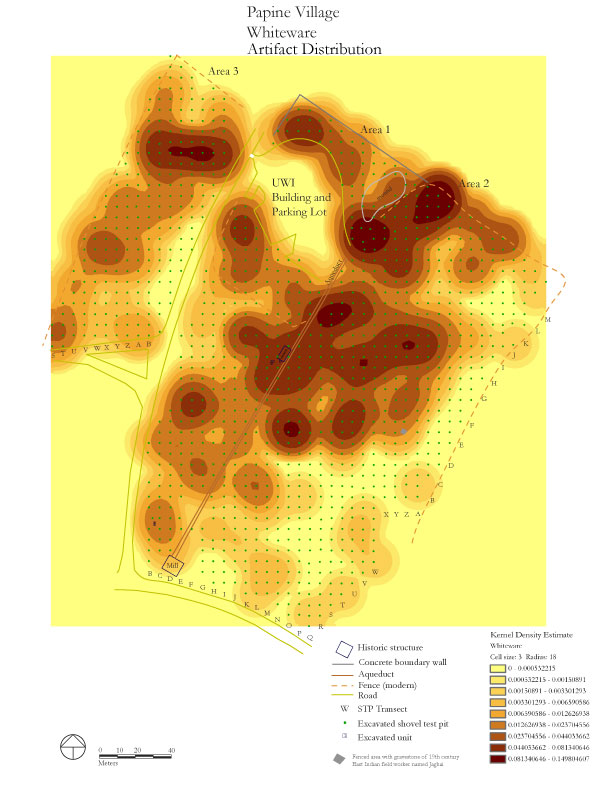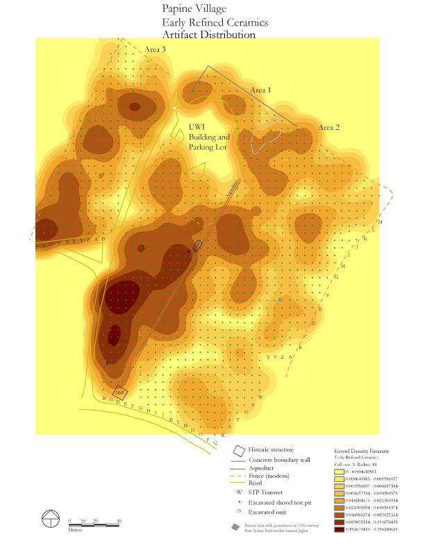 Figure 6. Distribution map of early refined ceramics at Papine Village, produced using Kernel Density Estimates.