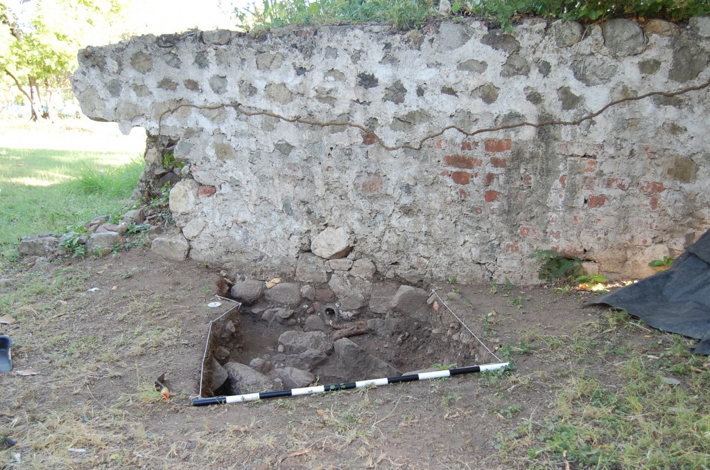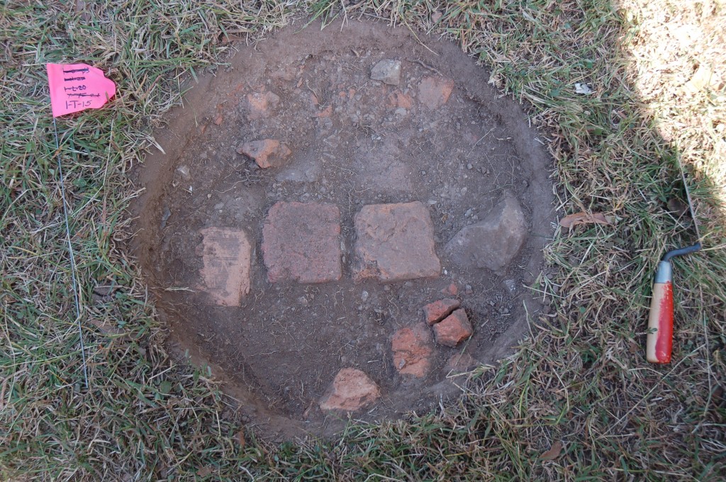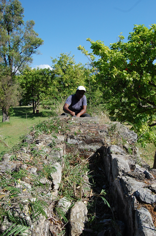 Work began in 2008 by establishing a UTM grid across the entire area of the village. During the 2008 season 398 STPs were excavated in transects running north/south and east/west through the center of the village area, as identified by historic plats and Dr. Karl Watson’s 1988 excavations. This cross-shaped test area was created to help us begin to establish boundaries of the village. During this season, Dr. Ramersad oversaw the excavation of Unit 1, a single 1-x-1 meter unit southwest of the aqueduct’s cistern. A cobble paving (Feature 1, originally interpreted as a cobble floor to a domestic structure) was discovered at a little over a meter deep. We interpret this feature as a cobble paving constructed around the cistern to control erosion and muddy conditions around the outlet for the cistern. This explains the mix of early- and late-19th century artifacts found together at this level. The feature consists of a hard-packed surface without stone in the southwest area of the unit and a stone-packed surface that appears to overlie it in the east and northwest corner. The feature was not excavated, as it was felt that the entire feature should be exposed before removing the cobbles.