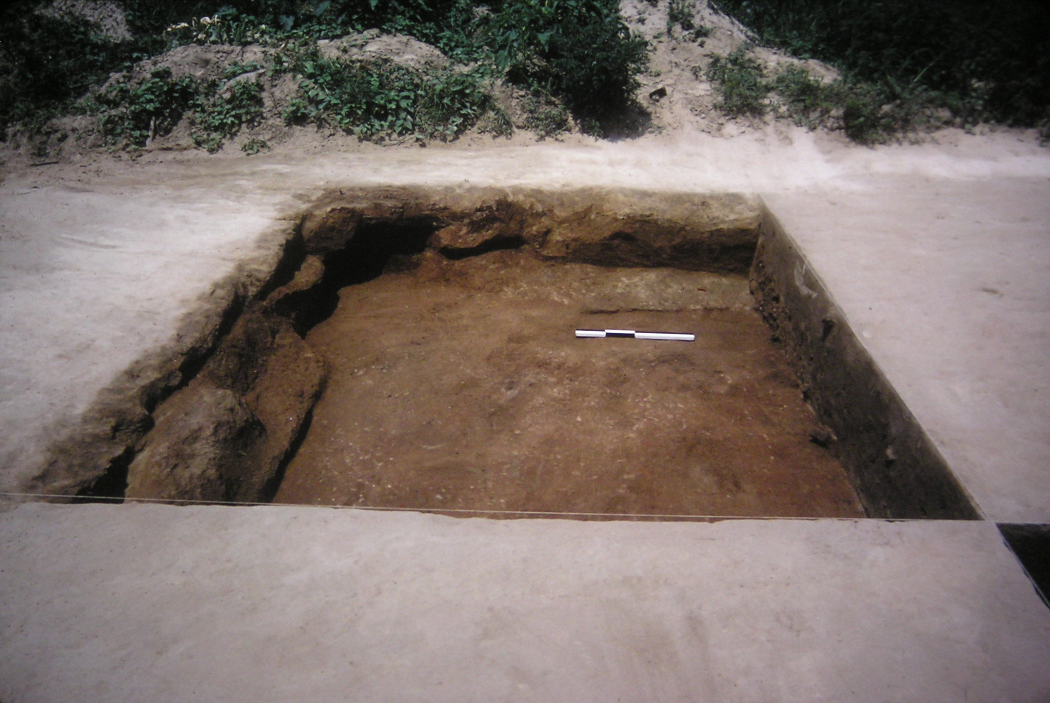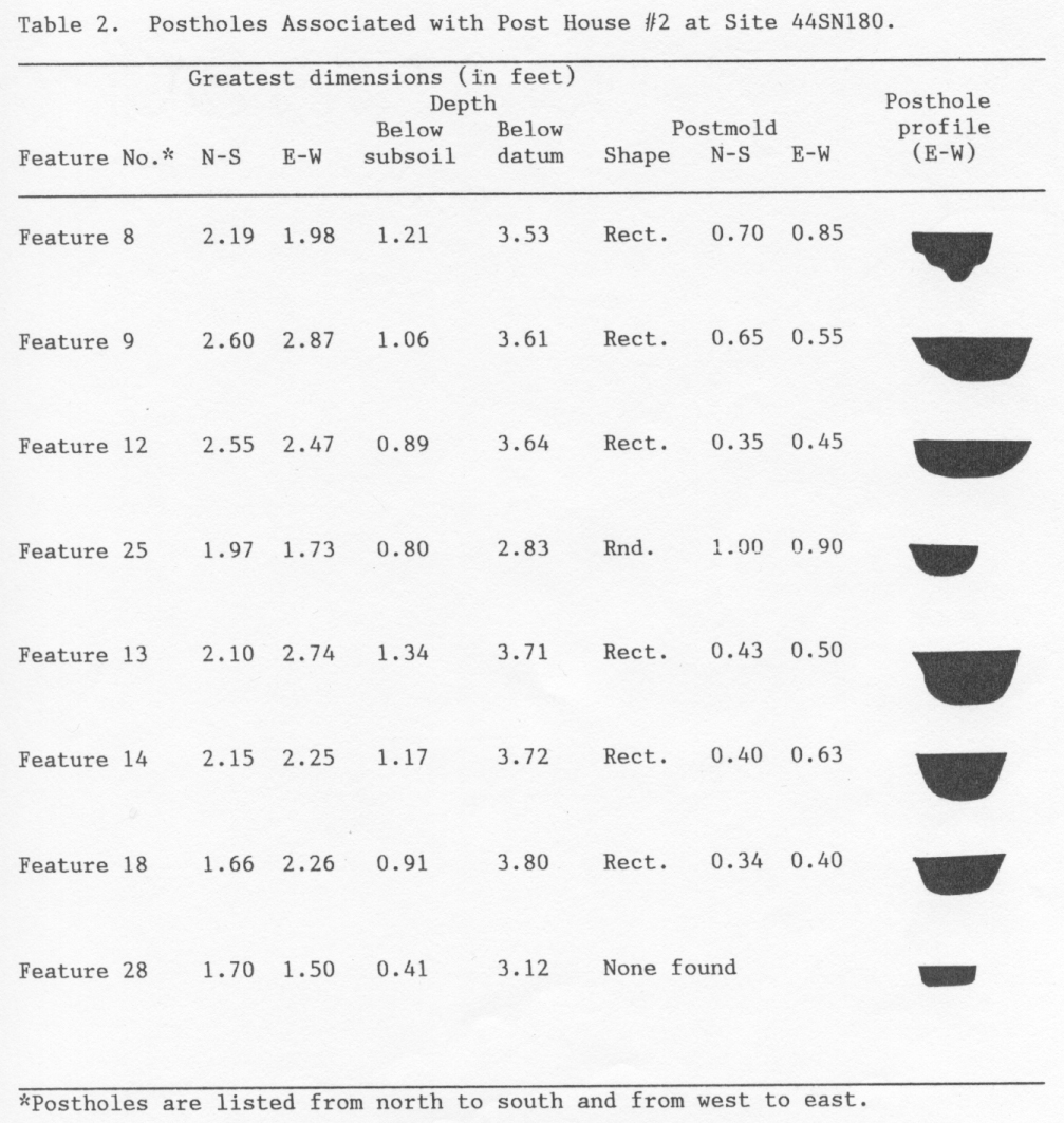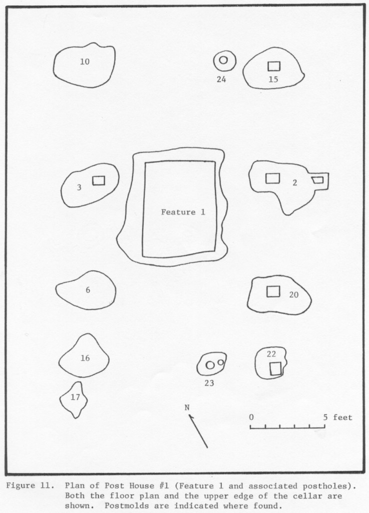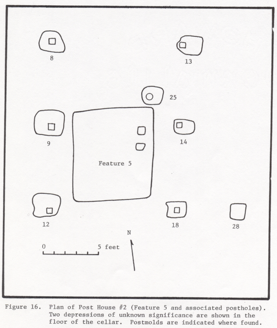 Some sixty feet to the southeast of F007 was one of two post-in-ground dwellings, Structure 2 on the site map. The structure was composed of a cellar (F001) and its associated postholes. The building measured 16 x 12 feet with a 5-foot porch or shed on the south side. The structure was torn down as opposed to being burnt down and the cellar remained open for some time after the destruction of the house (Reinhart 1987:31,38).