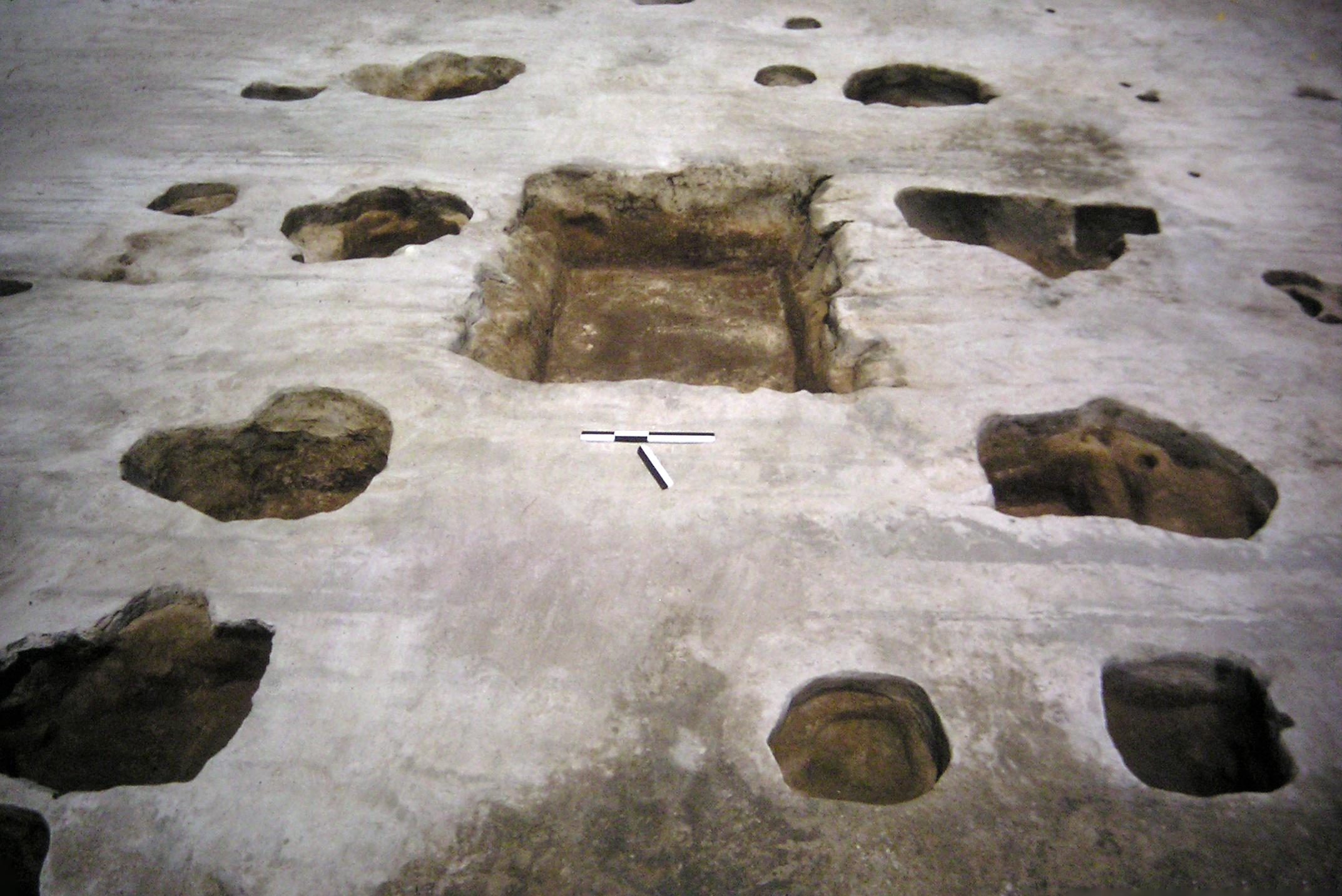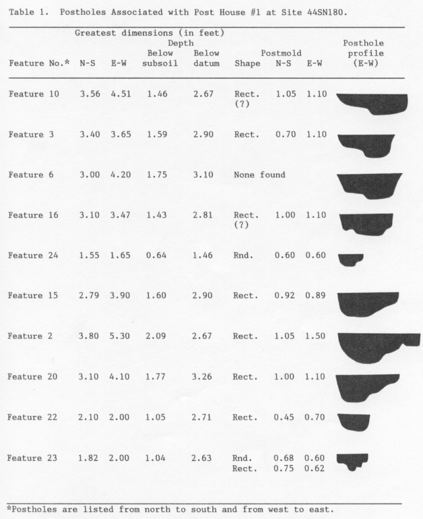 - Some postholes on the site map are represented schematically. The excavators’ site map shows the location of these postholes but not their shape. The postholes’ context records record their dimensions but DAACS has not been able to locate plan drawings of the postholes. As a result, DAACS has chosen to represent these postholes as boxes with the appropriate dimensions and locations.