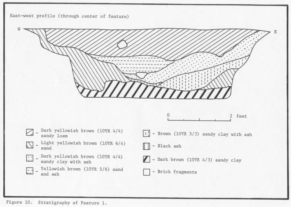 The outbuilding (F053 and Structure 3 on the site map) was located thirty-seven feet east of F001 and seventy-five feet west of F005. It measured 8 x 7 feet and had a large, irregular patch of burnt sediment in its center. Feature 53 was tentatively identified as a smokehouse by its excavators. This identification is based on the burnt area in the center of the floor combined with the lack of evidence suggesting the structure itself burned. In addition, the building’s small size and limited quantity of domestic artifacts added to this conclusion (Reinhart 1987:45-46,52).