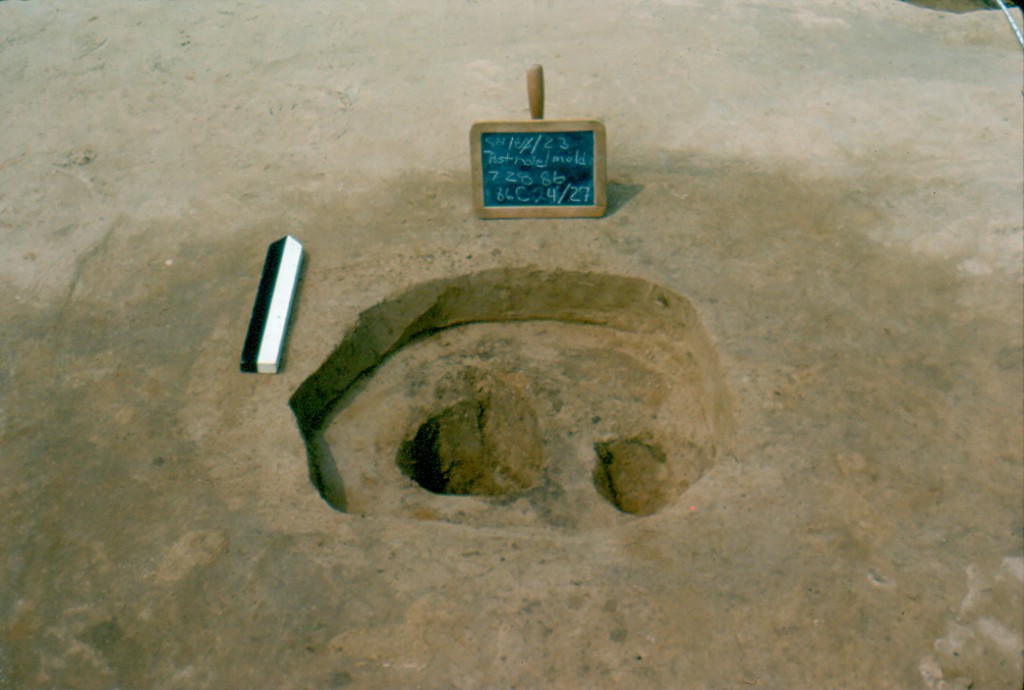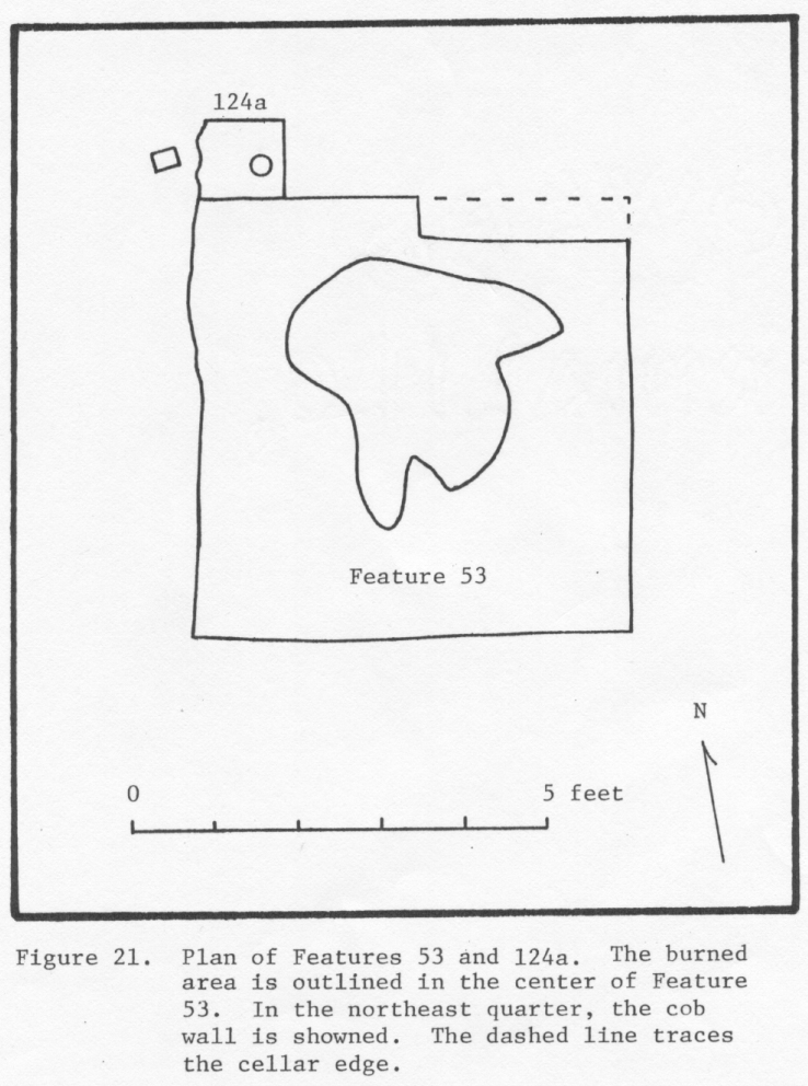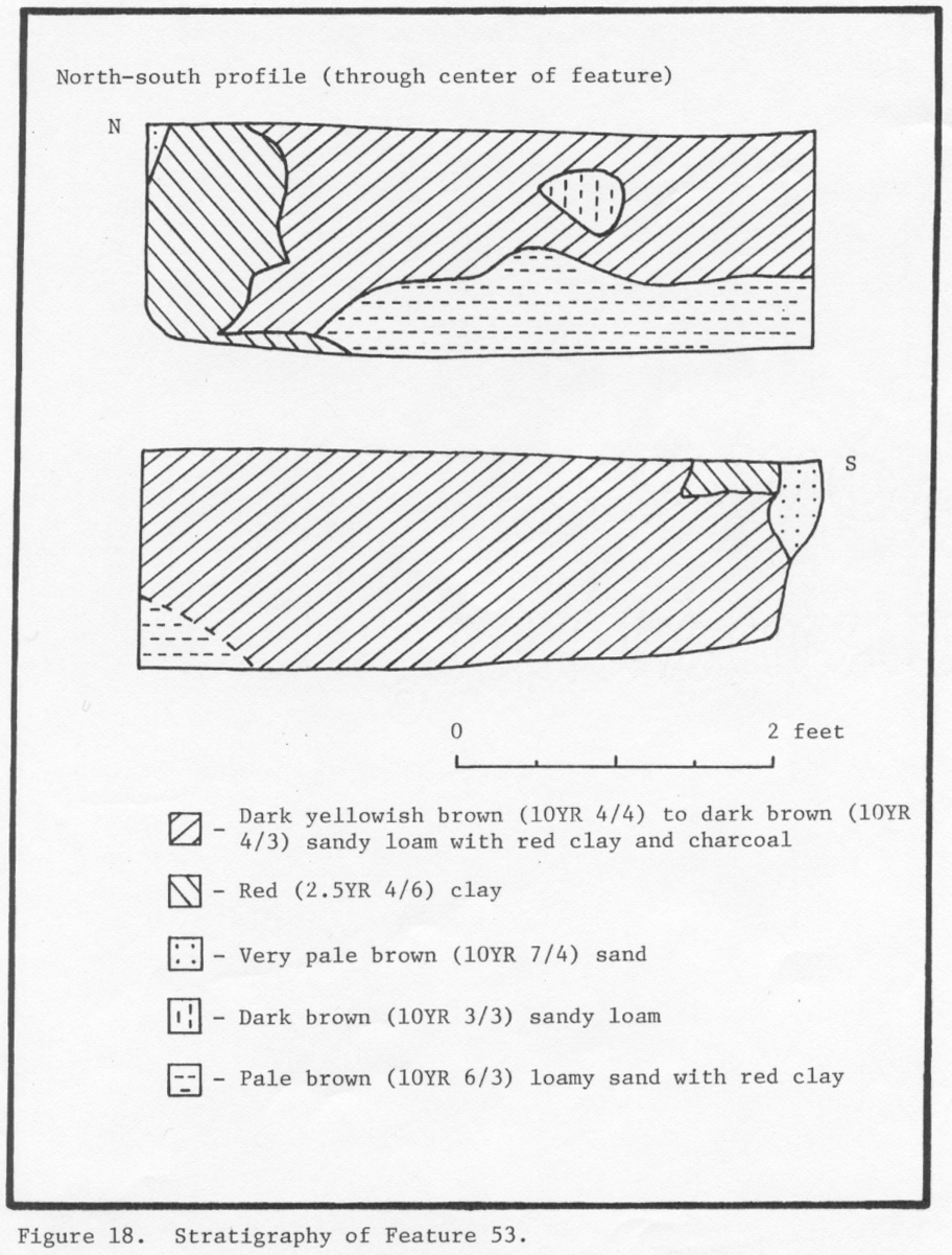 Two pits to the east of F053 were probably associated with exterior activity areas. Feature 19 (6.5 x 3.5 feet) and Feature 21 (6.75 x 3.5 feet) were both a foot or less deep (Reinhart 1987:52,55).