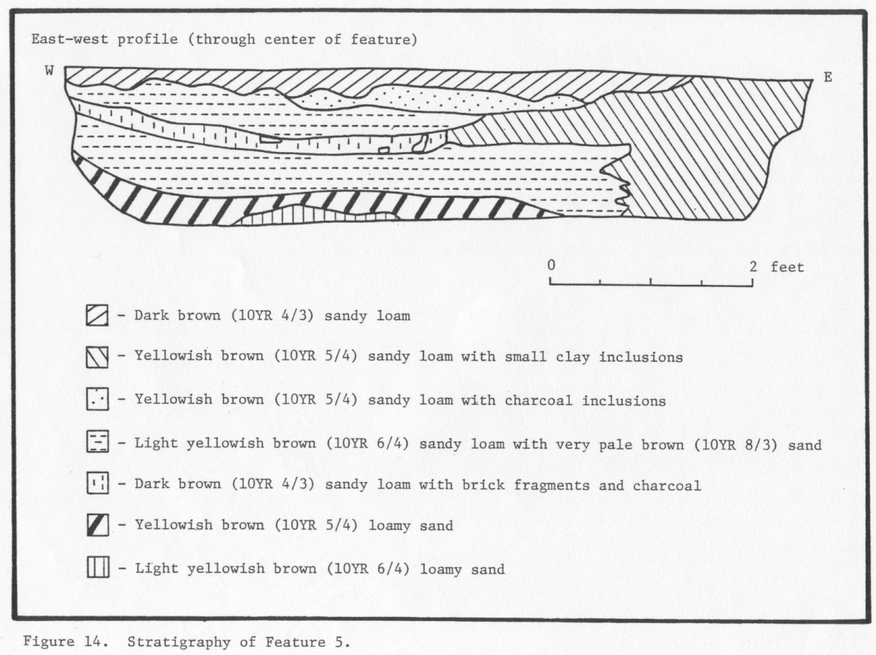 One hundred and twenty feet east of F001 was the second earthfast dwelling, Structure 4 on the site map. The archaeological remains of this structure consist of a cellar (F005) and its associated postholes. This building also measured 16 x 12 feet. This cellar was also used as a trash pit after its destruction. The trash was concentrated on the west side of the cellar indicating that this structure occupied the eastern edge of the site (Reinhart 1987:38-39,45).