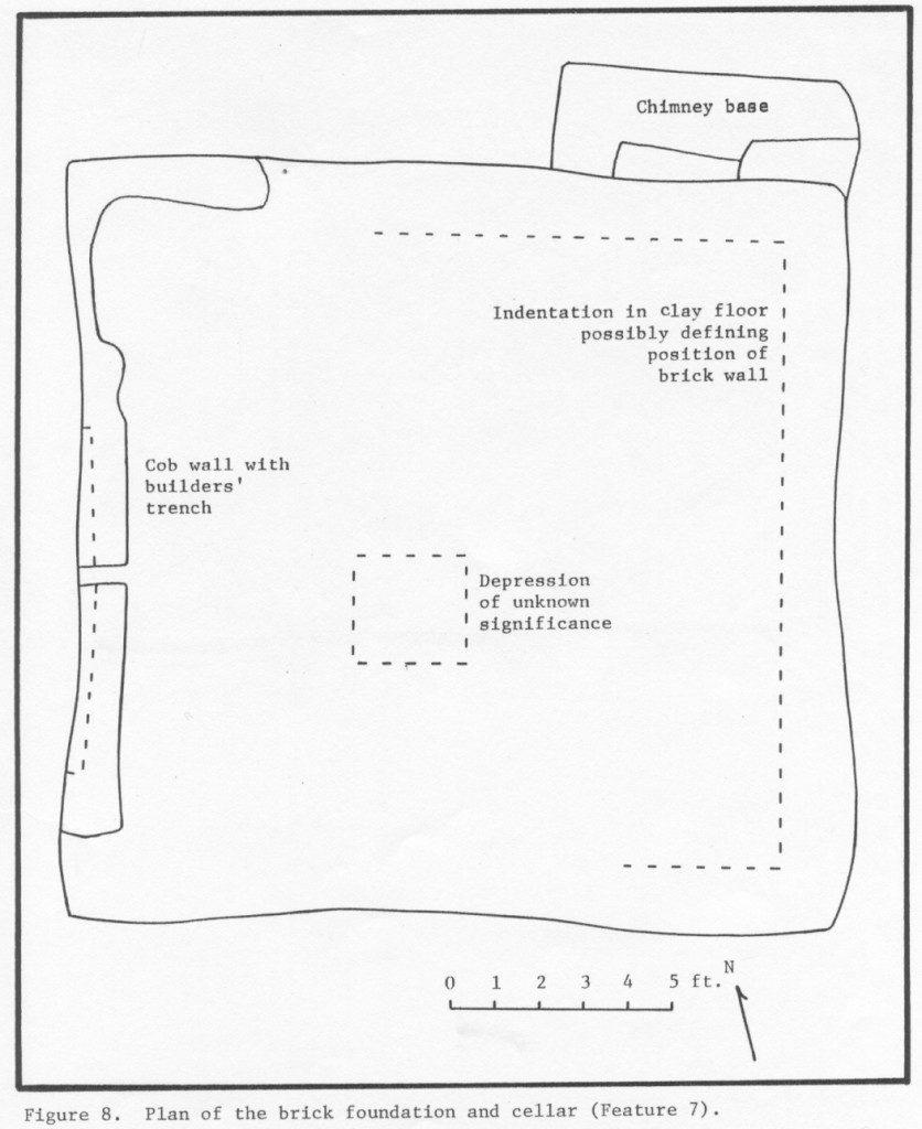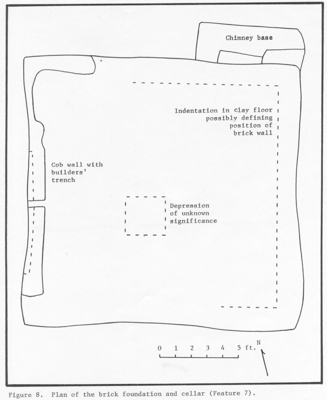 Three dwellings and an outbuilding were identified at the Pope site. The most substantial dwelling, Structure 1 on the site map, was a frame building with a brick and cob foundation, and cellar; all subsumed under Feature 7 (DAACS feature number F007). The foundation hole measured roughly 16 foot square. Evidence for a chimney base was found in the northeast corner of Feature 7. A line of posts just north of the cellar could have supported a porch. Based on the number of artifacts, the cellar was most likely not used as a trash depository and when Feature 7 was no longer inhabited, the site was abandoned (Reinhart 1987:28,31).