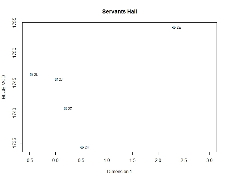 Although the correspondence analysis produced no statistically significant phases, the dimension 1 by BLUE MCD plot compared with the site’s Harris Matrix, clearly indicates that the Feature 1 trash pit was a jumble of secondary refuse dating from the second quarter of the eighteenth century. Note that a stratigraphically higher context (2H) has the earliest date while contexts it seals (stratigraphically lower contexts, 2J, 2L, and 2Z) have later dates.