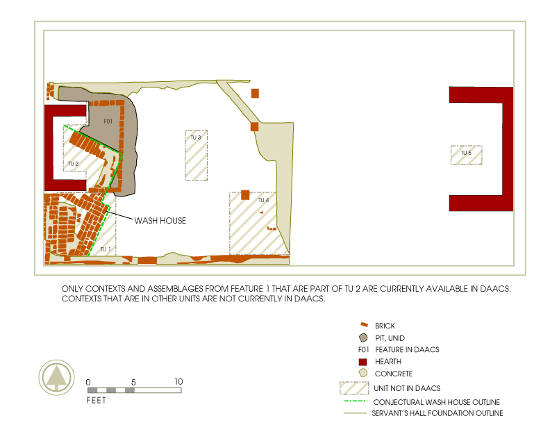- The data currently in DAACS represent artifacts and contexts associated with a small trash pit excavated in test unit 2 and not the layers associated with the broader excavation (including test units 1, 3, 4, and 5 inside the Servants Hall/Wash House).