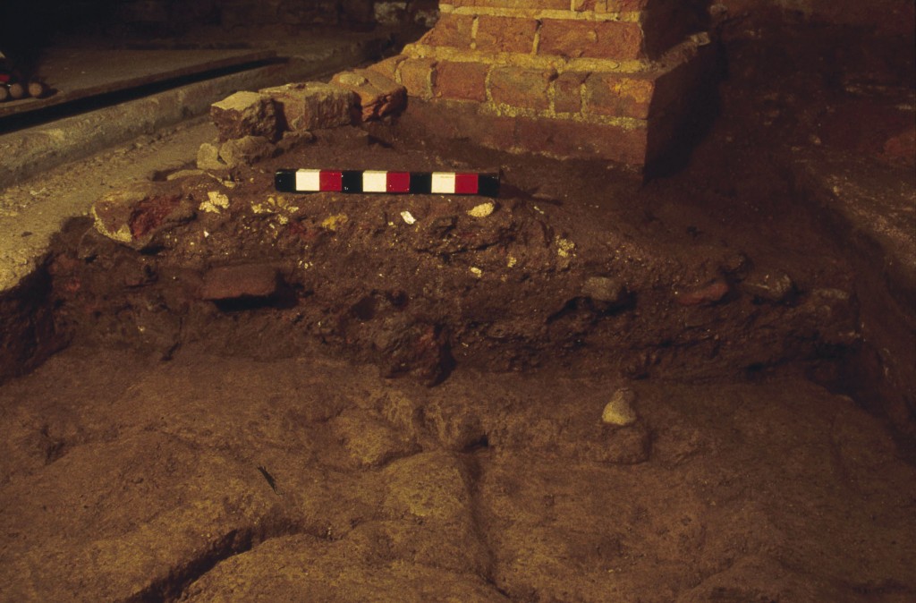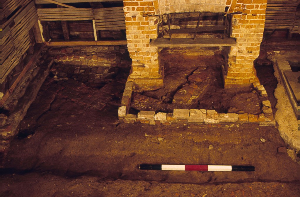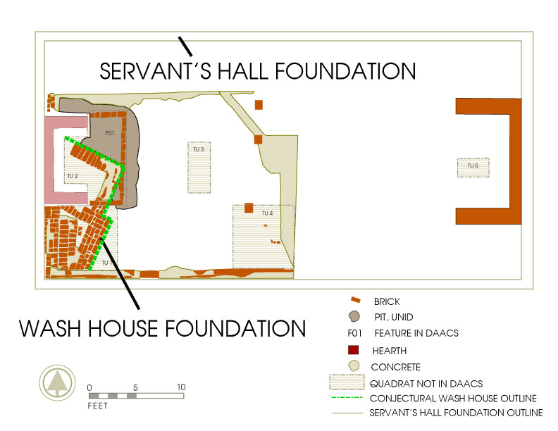 In early 1998, archaeologists from the Mount Vernon Ladies’ Association were given a unique opportunity to conduct excavations below the extant floor of the Servants Hall (built in 1775) in conjunction with a project to restore the northeastern outbuilding flanking the mansion’s west front. Part of this project required the removal of the modern floor, at which time archaeologists excavated 5 test units. This work revealed foundations of an earlier generation outbuilding, thought to be the wash house as documented in Lawrence Washington’s 1753 probate inventory (Washington 1753), including the northeastern corner of the building and hearth.