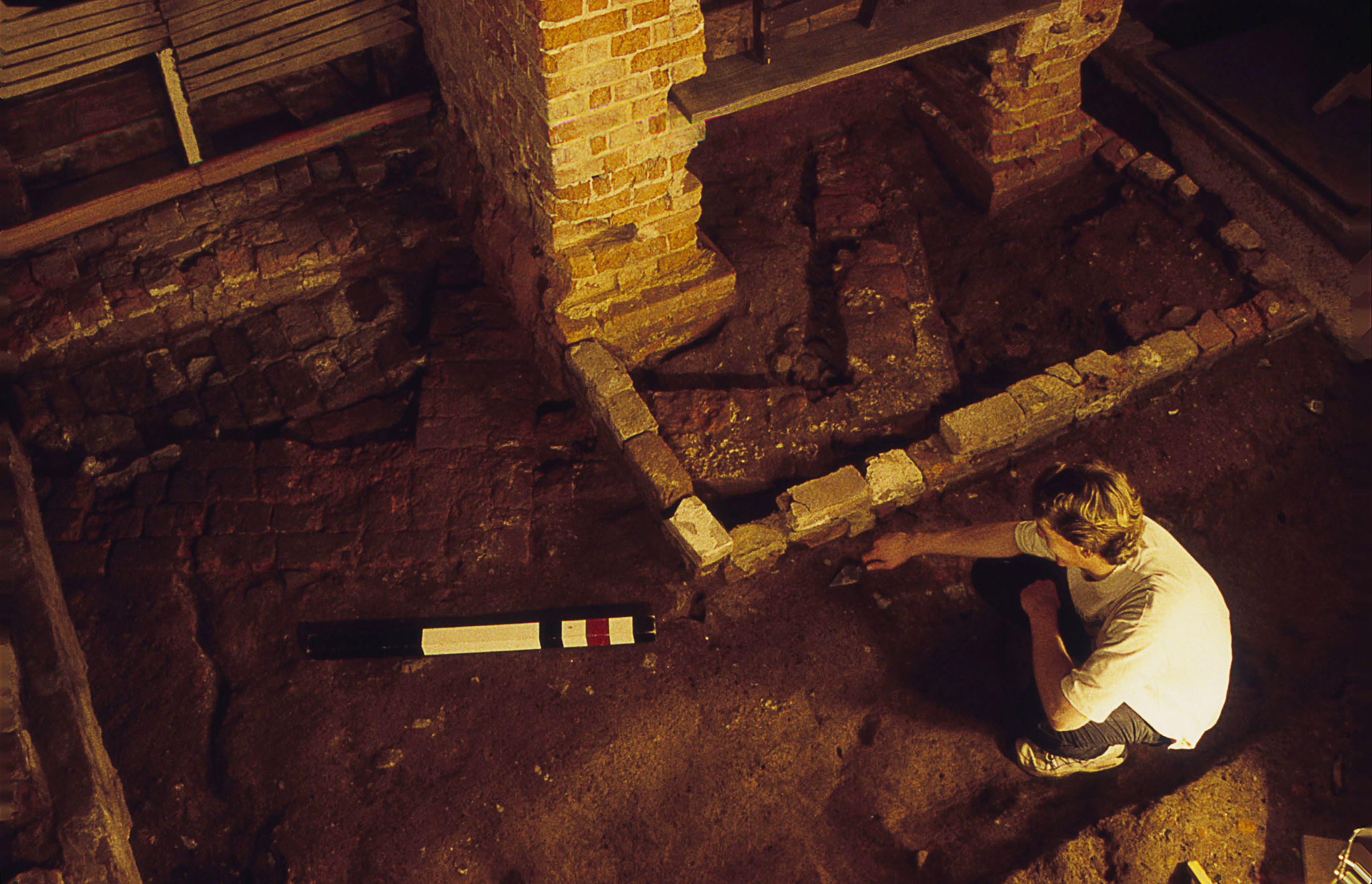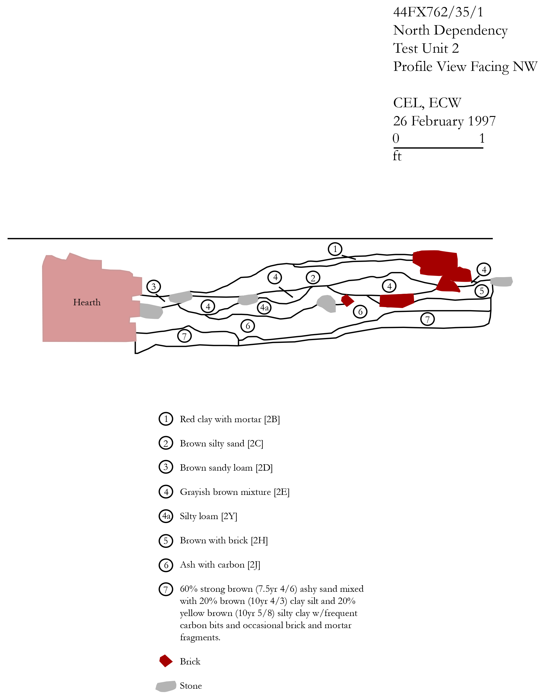 This short-term project, excavated by Christy Leeson and Thane Harpole under the direction of Esther White, took placed in February and March 1998. Test units, including test unit 2 containing the pit, were laid out by triangulating from the interior corners of the Servants Hall foundation.