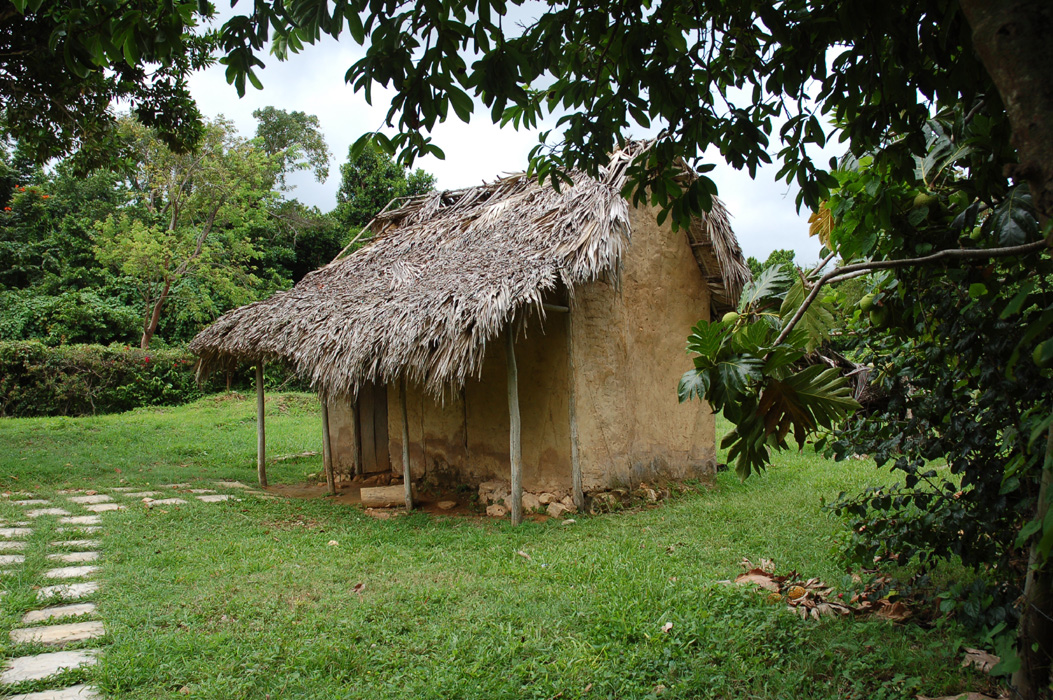 A reconstruction of an early-period wattle and daub slave house at Seville Plantation. This reconstruction was based on data recovered during Armstrong’s excavations at Houses 15 and 16.