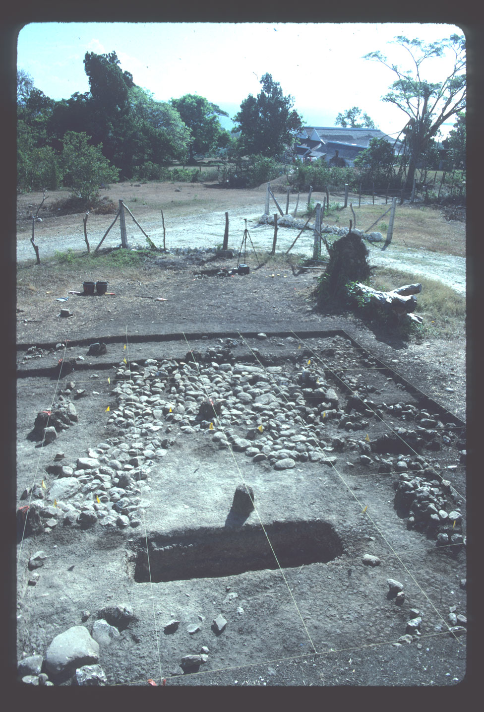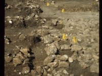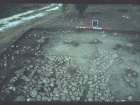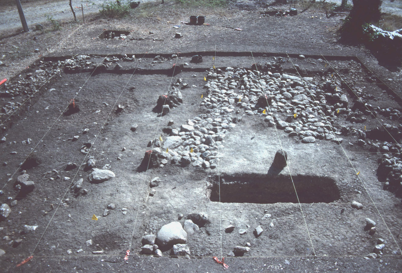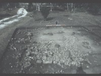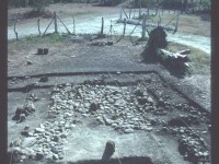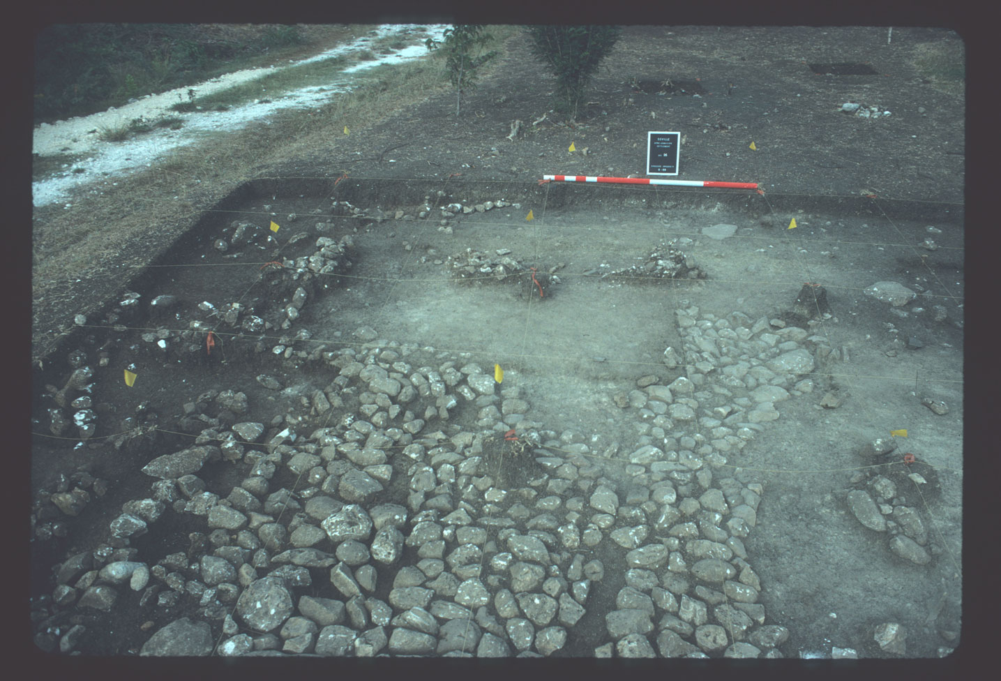 View of House 16, taken from the south. The marl floor, cobble floor, and yard burial are visible in this photograph.