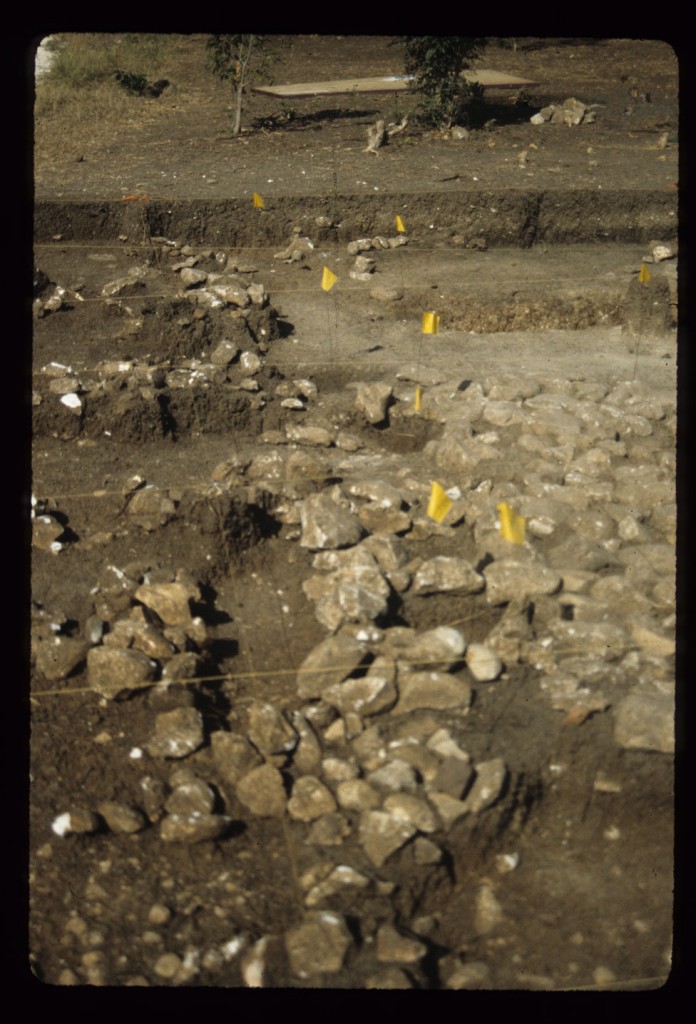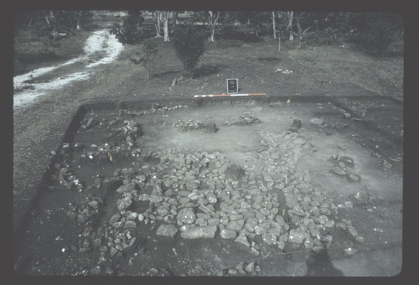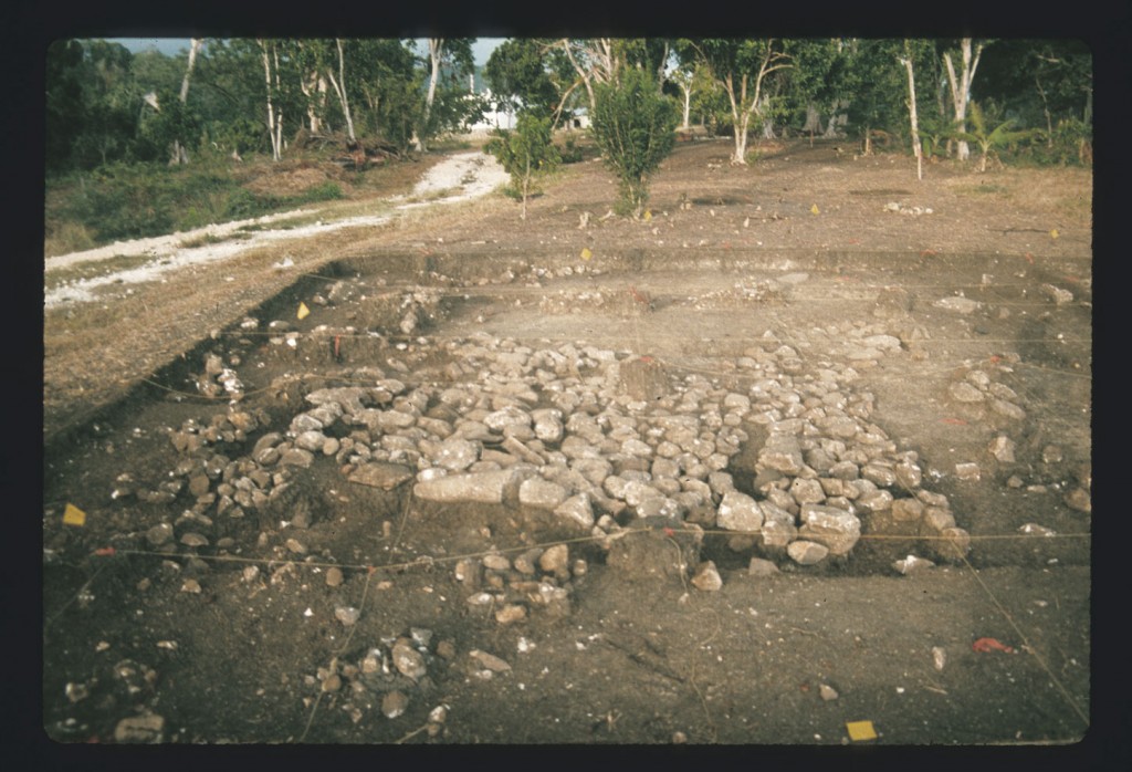 View of House 16, taken from the south. The marl floor, cobble floor, and yard burial are visible in this photograph.