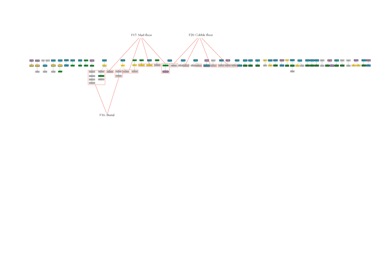 The stratigraphic relationships among contexts are summarized in the Harris Matrix for House 16. Phase assignments from the seriation are shown on the Harris Matrix in color, facilitating comparison of the seriation chronology and the stratigraphic chronology of the site.