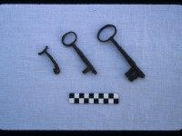 A significant find in the yard was the presence of a burial placed in a hole dug into the bedrock within the house yard compound. This burial (defined as SAJ-B1, known as Feature 16 in DAACS) was initially thought to have been within the house as it was found beneath the same crushed white marl flooring or surface material that was found within the southern room of the house. Upon closer inspection it was determined to be in the yard immediately outside of the house. Subsequent excavations uncovered three other house-yard burials in similar contexts associated with specific house sites in the old village (Armstrong and Fleischman 2003: 53). The House 16 burial contained materials that suggest a mid-1750s date of burial. The fact that the burial site was covered with a thin lens of crushed marl indicates that this individual was buried prior to the destruction of the house and that the house and yard continued in use, with probable new layers of marl surface coats applied to the yard and the house floors periodically. The individual was a male, who was between the ages of 20-30 at the time of his death. Osteological evidence indicate that he was of African ancestry and that he had some severe chronic health problems prior to his death. Pathologies of the bone suggest that this individual may have even been a paraplegic at the time of his death and that he had lived for some time with these conditions (see Armstrong and Fleischman 2003:53). The study did not determine a cause of death but does suggest that this individual was cared for by the community and the placement of the burial within the house-yard projects the possibility that this individual represented a special person within the community. These remains, along with the remains found in three other burials at Seville, were returned to the site following analysis and were reburied in 1997 in a formal ceremony (Armstrong and Kelly 2000).