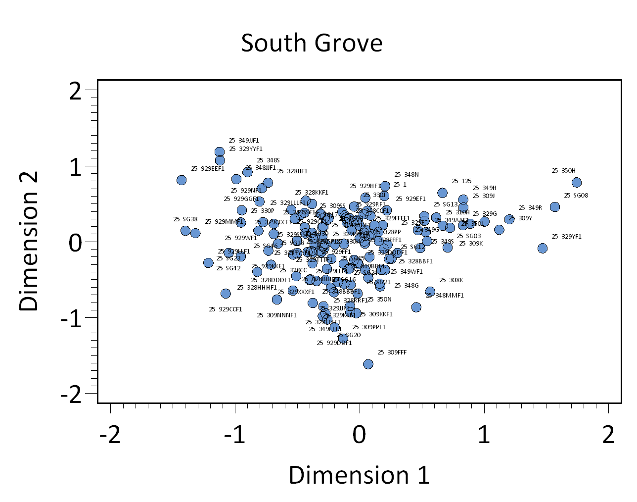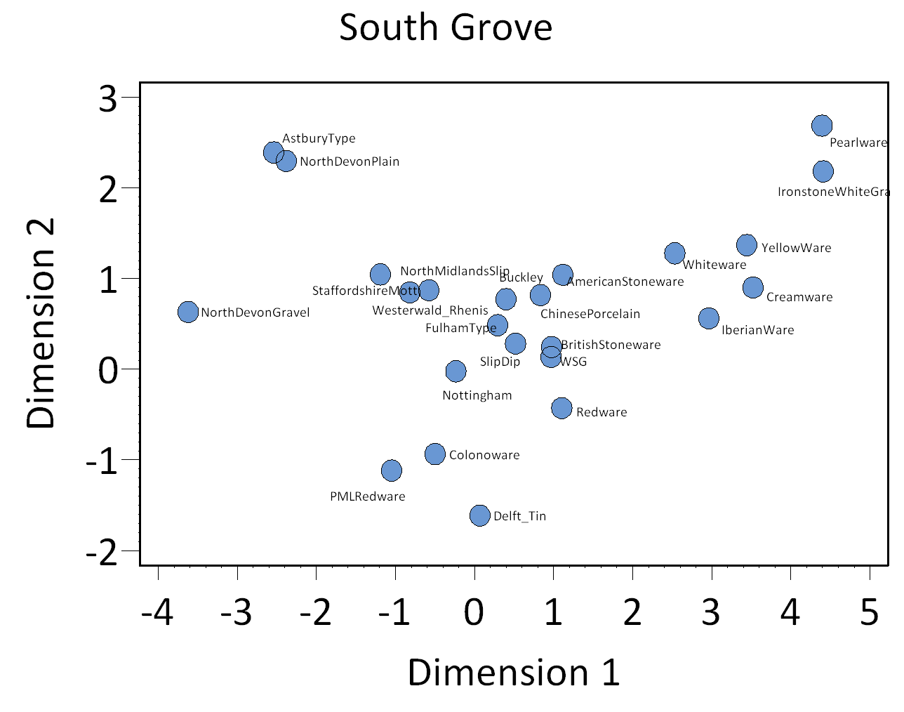 In addition to revealing temporally distinct assemblages, the CA demonstrates that there is interesting and significant synchronic variation during the earlier occupation phases at the South Grove. Returning to Figure 1, note that the point scatter is more widely arrayed along Dimension 2 to the right of the zero point on Dimension 1 than to the left . Figure 2 shows which ceramic ware types contribute to the assemblage locations along Dimension 1 and Dimension 2: type locations on Dimensions 1 and 2 are correlated with the locations of assemblages in which they are most frequent.