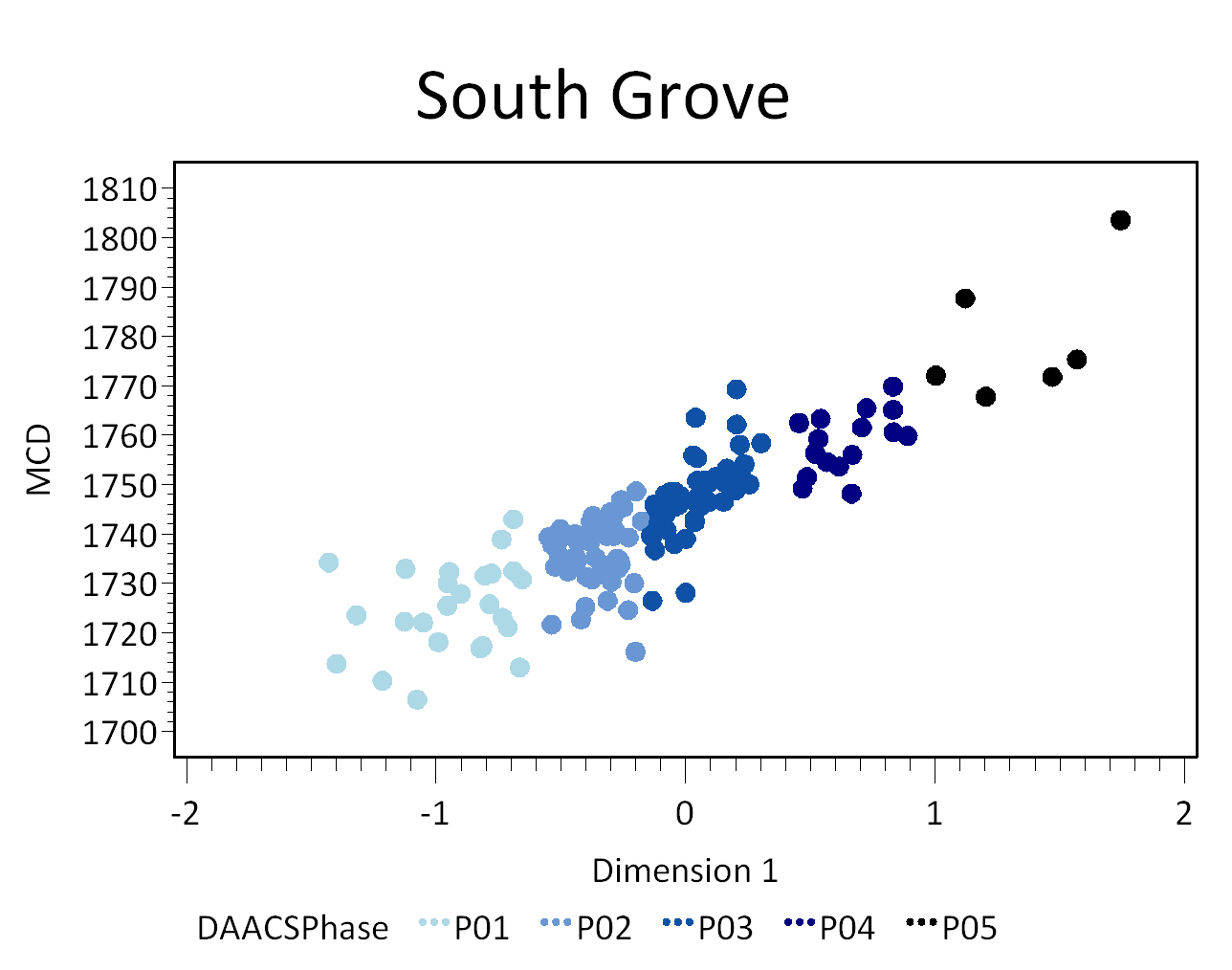 DAACS Phases are groups of assemblages that have similar correspondence-analysis scores, similar MCDs, or both, and are therefore inferred to be broadly contemporary. Phases have a P-prefix that precedes the phase number (e.g. P01 equals Phase 1).