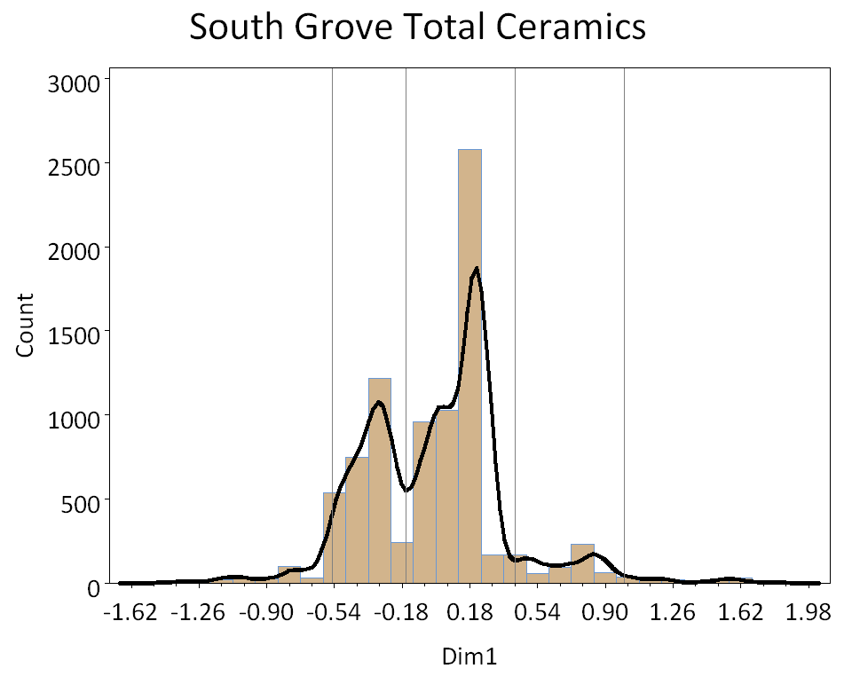 The CA results produced a strong correlation between Dimension 1 scores and MCDs (Figure 3), indicating that Dimension 1 represents time from left to right. Based on the dips in ceramic counts observed in a histogram of Dimension 1 scores, where the vertical axis measures ceramic assemblage size, we divided the site into five occupational phases (Figure 4).